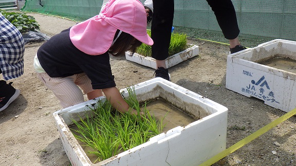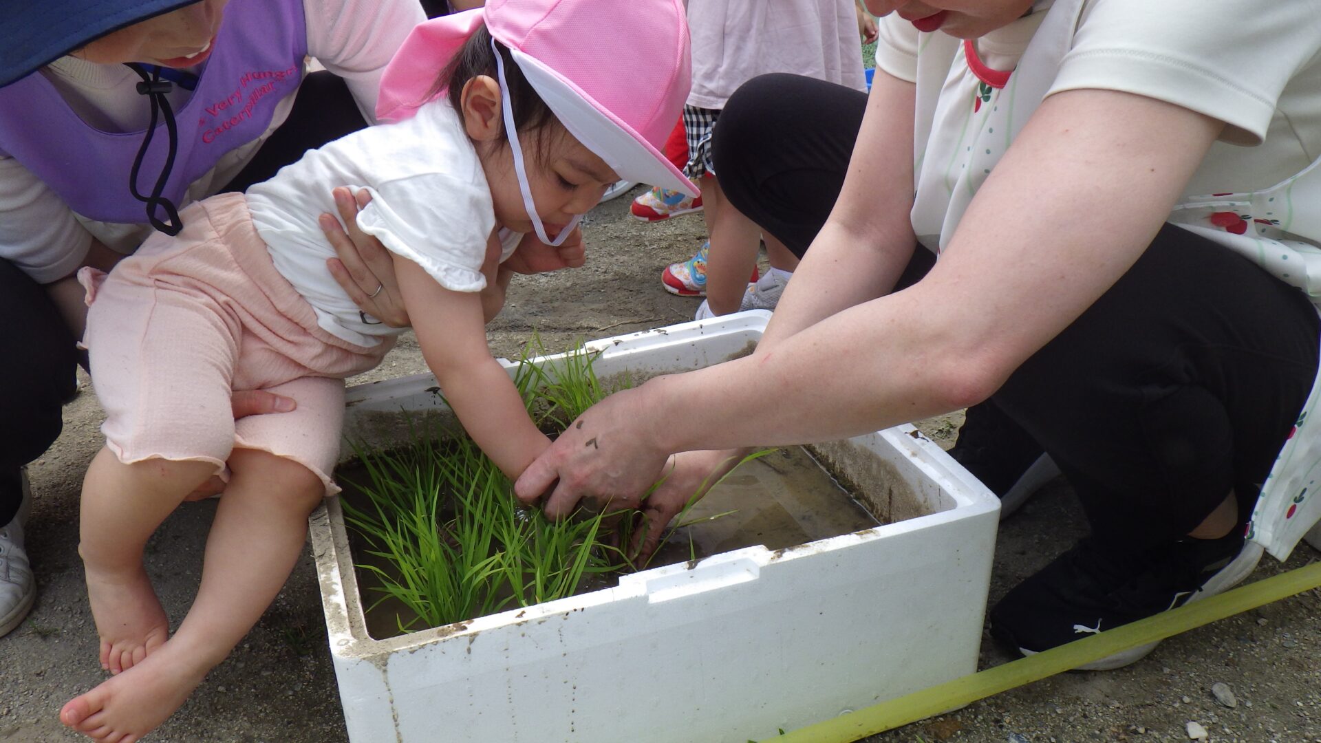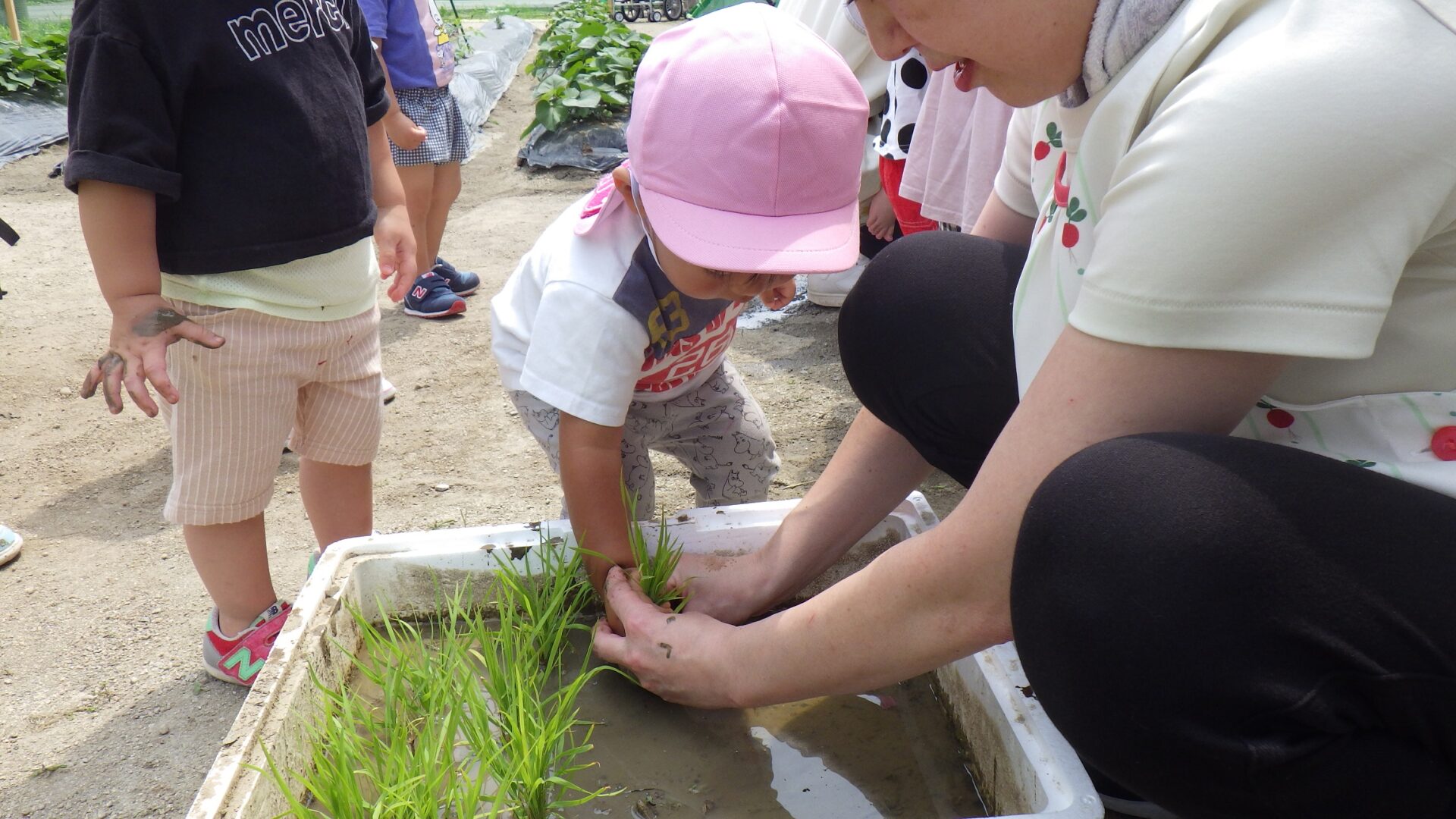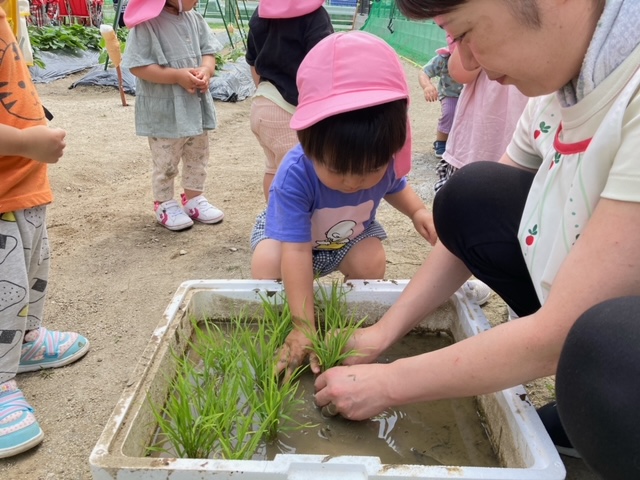 だいち組みんなで畑へ行き、サツマイモの苗や野菜の苗を観察しました。また、お米の苗植えを体験しました。泥んこになった手を見ても気にせず何度も苗を植える子、植えた後の手を見て「うわぁ~!」とビックリ。泥だらけの手を見で涙をする子も。子どもたちにとって、とっても貴重な体験となりました。