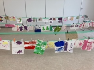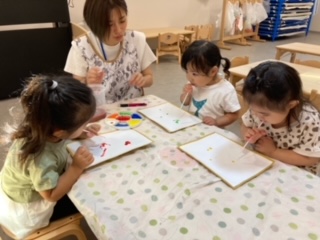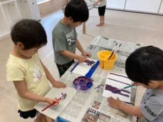 デカルコマニーに挑戦。歌を歌いながら描く子や無言で集中して描く子など子どもたちの取り組む姿は様々でした・・・。