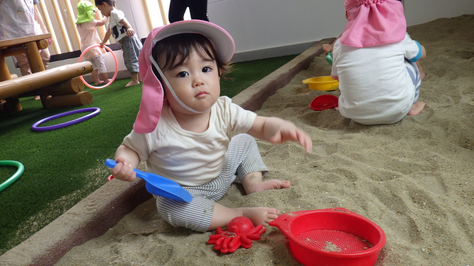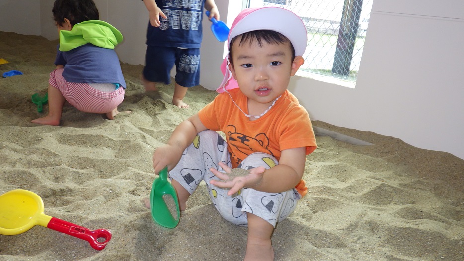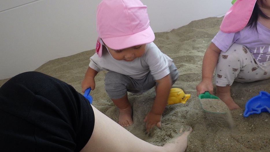 砂場は楽しいけど、ちょっと冷たい砂の感触に