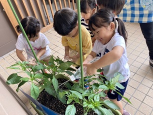 あめ組さん(2歳児)はピーマンの水やりを嬉しそうにしていました。