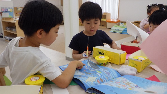図鑑や絵本を参考に、海の生き物について学んで、イメージを膨らまして・・・