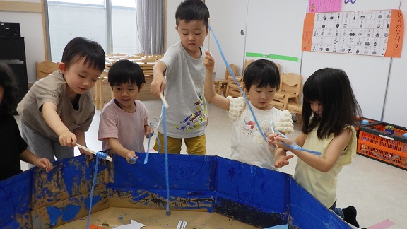 自分たちで作ったもので遊ぶ楽しさは別格のようで、子どもたちのウキウキ・ワクワク感が満載の魚釣り大会となりました。