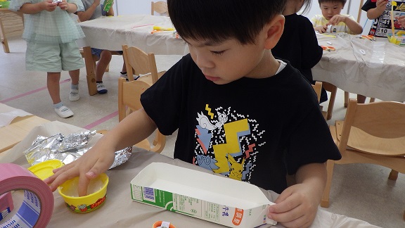 最初から自分で作るのはとても難しい事ですが、私たち保育者は、あえてヒントを出さず、否定もせず、すべてを見守ります。