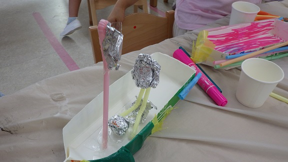 水に浮かべてみながら、試行錯誤を重ねる子どもたちでした。