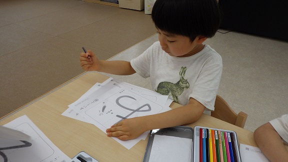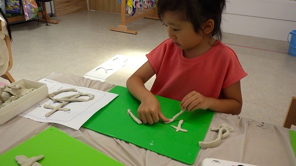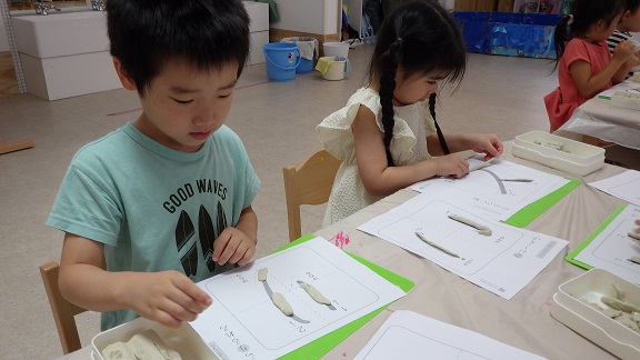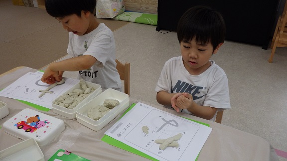 自分の名前の文字を、粘土で作り上げながら、文字のカタチを視覚的に覚えていきます。
