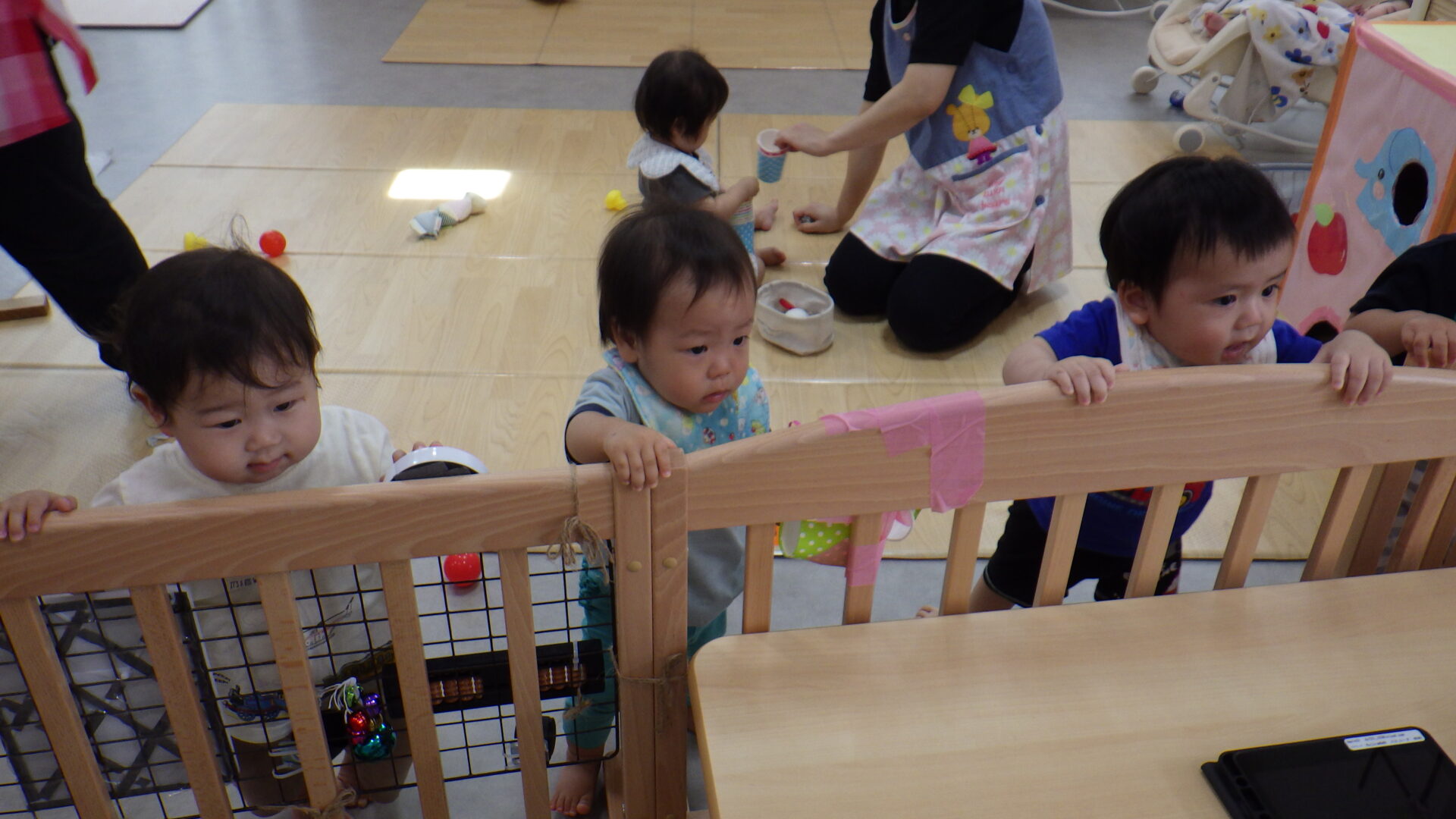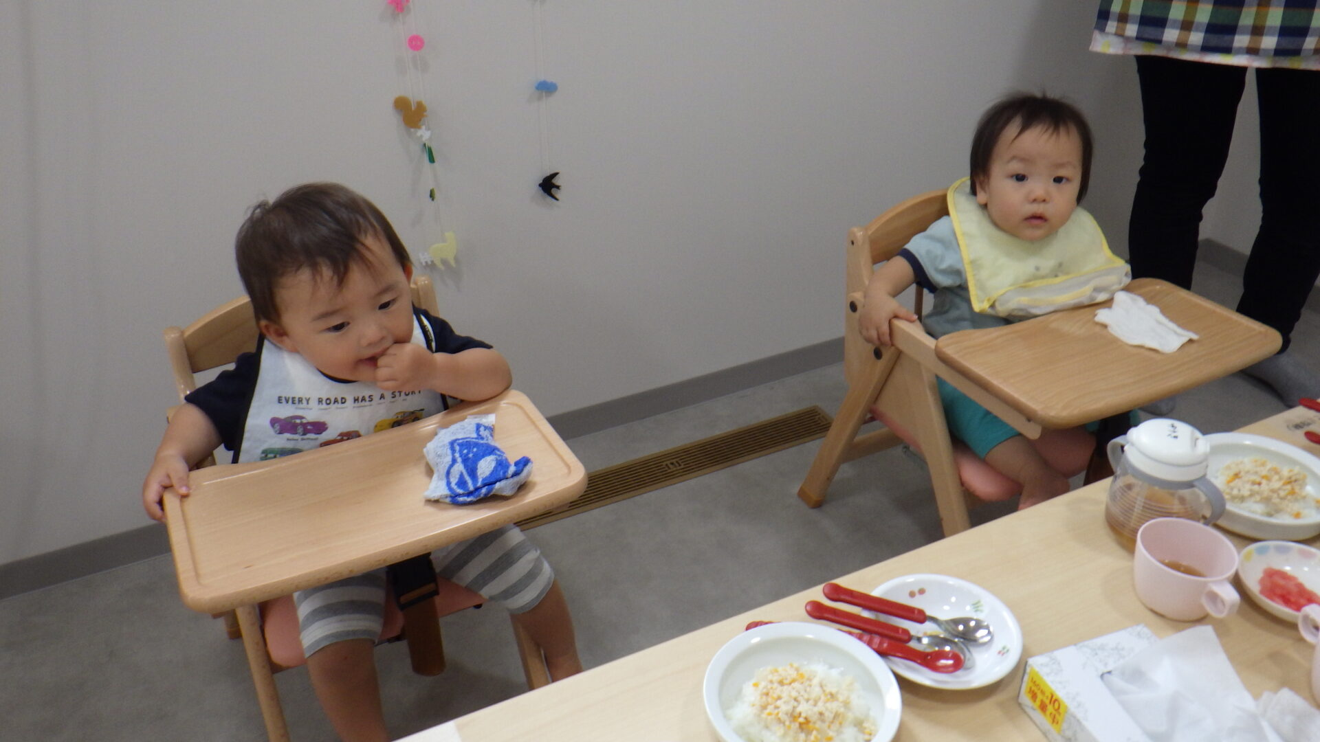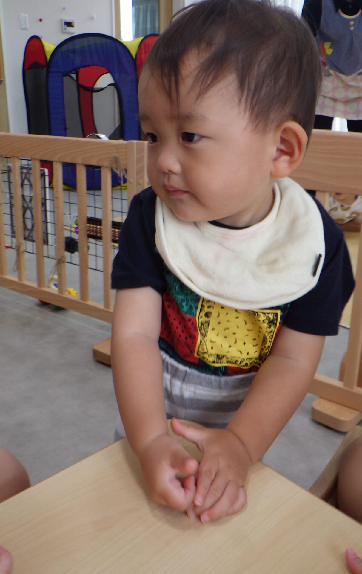 「はやく、食べたーい」と先生達の様子をつかまり立ちして、見ているのです!!