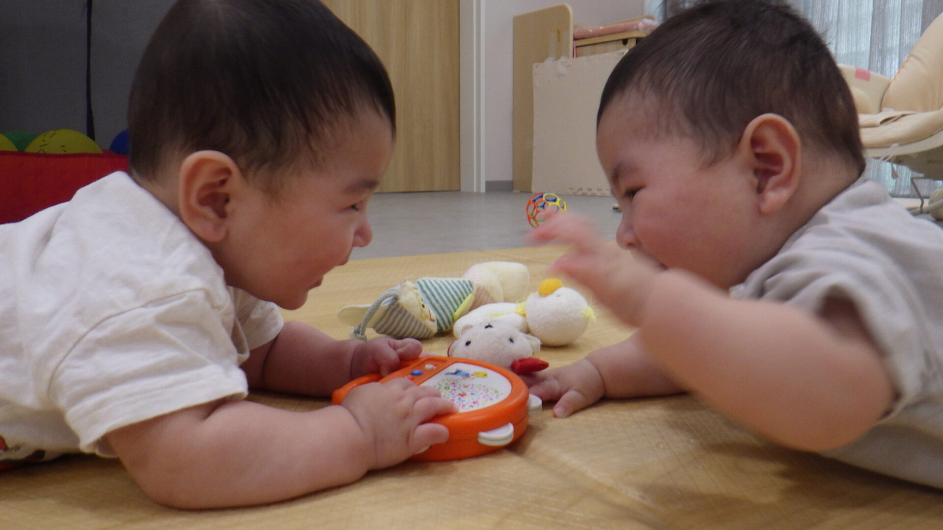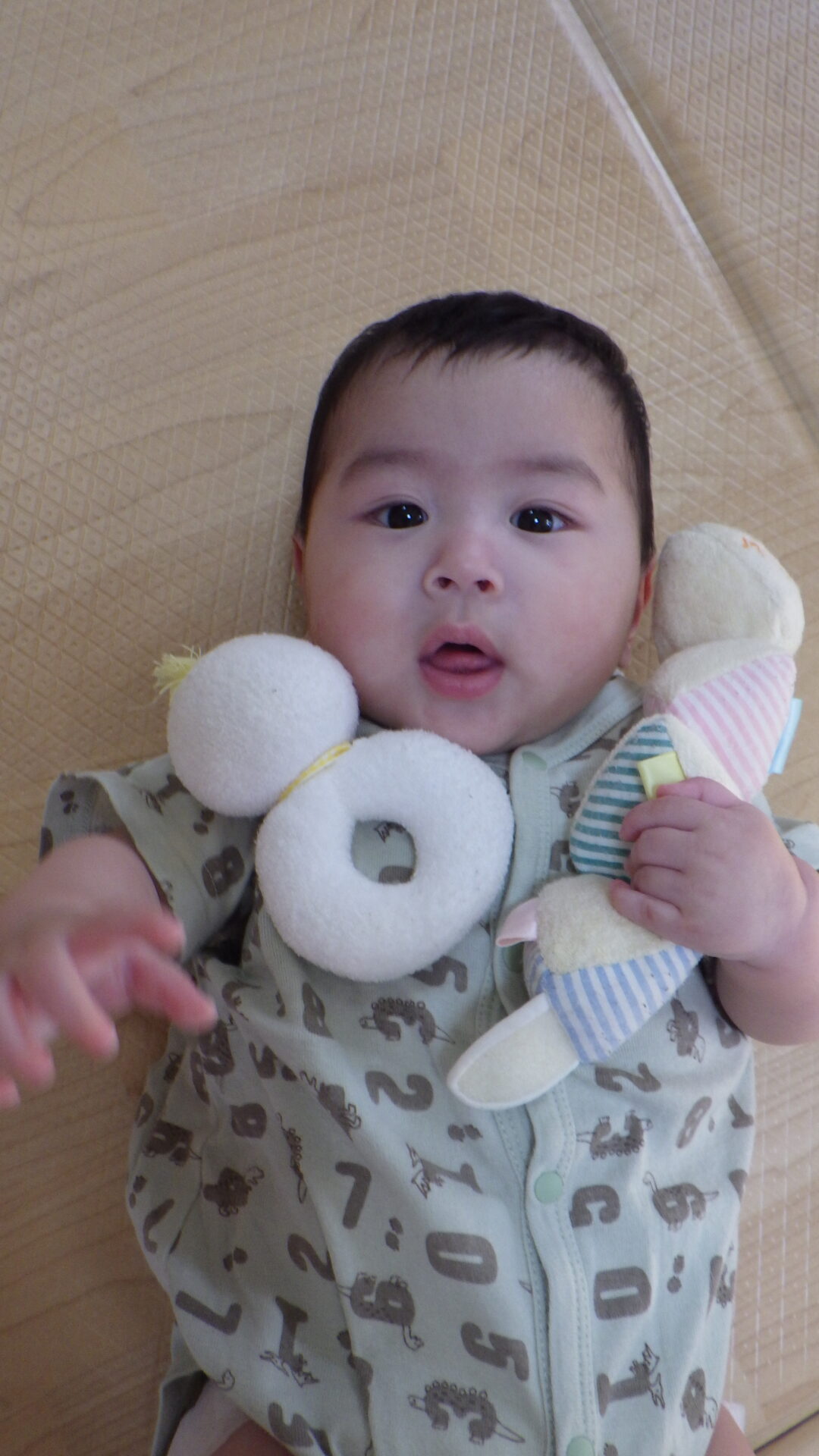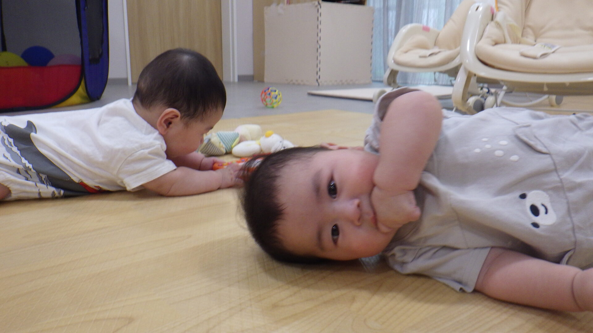 「はやく、食べたーい」と先生達の様子をつかまり立ちして、見ているのです!!