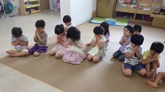 静まり返ったそら・くじら組の保育室では、平和の願いを込めて黙とうを行いました。