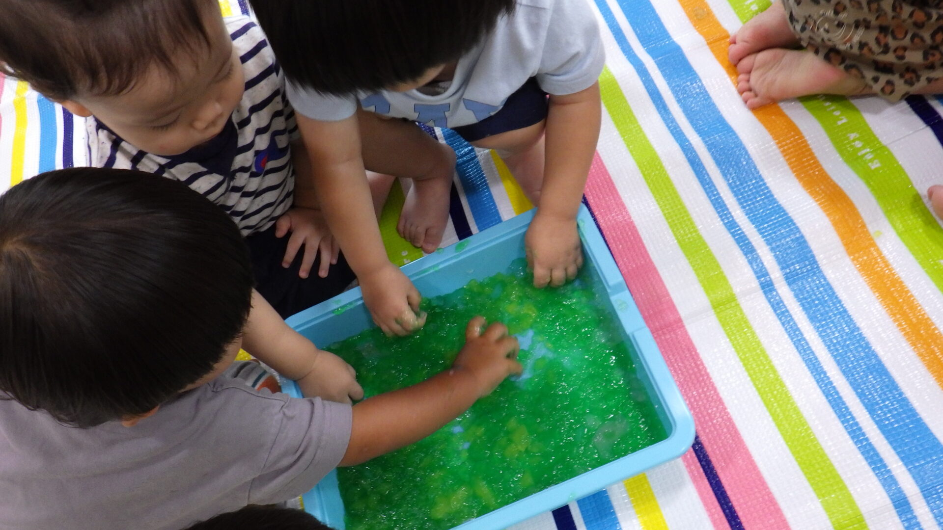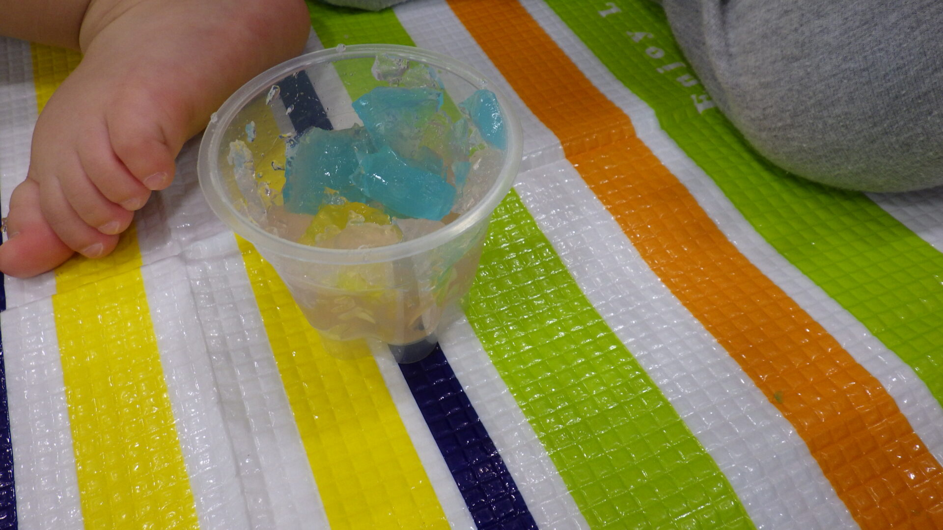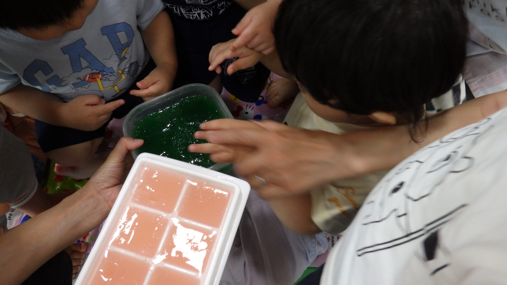大きな入れ物に寒天を移して、両手で感触を楽しみますよ!