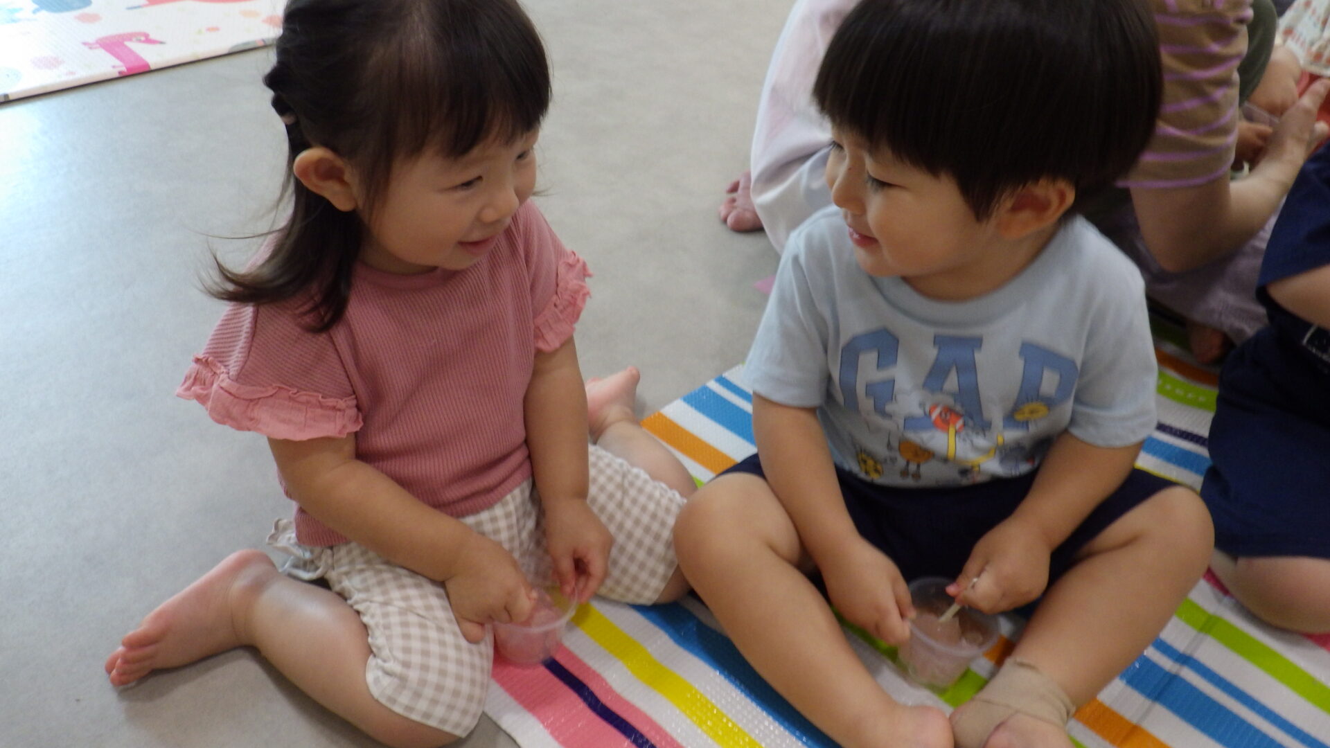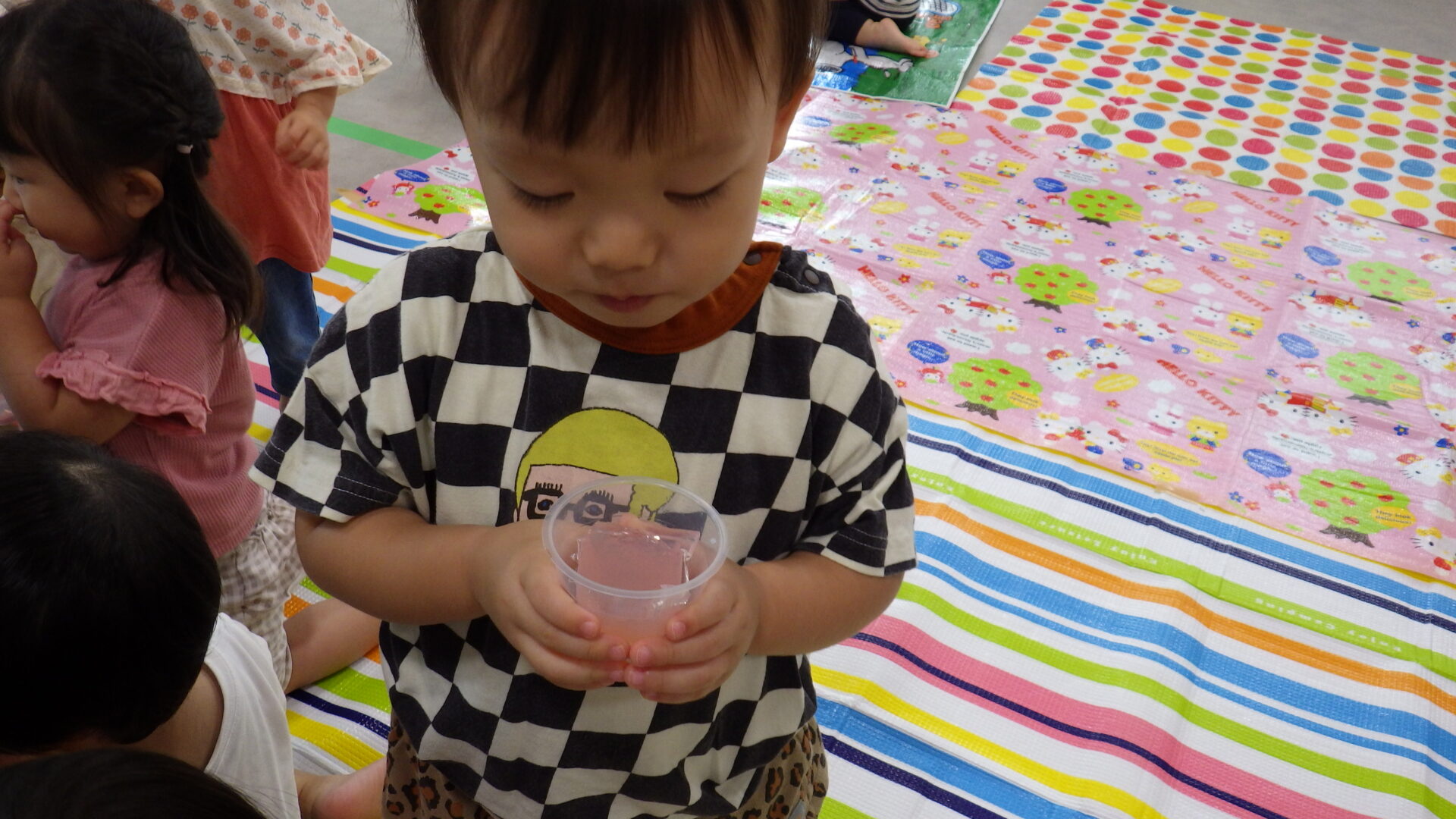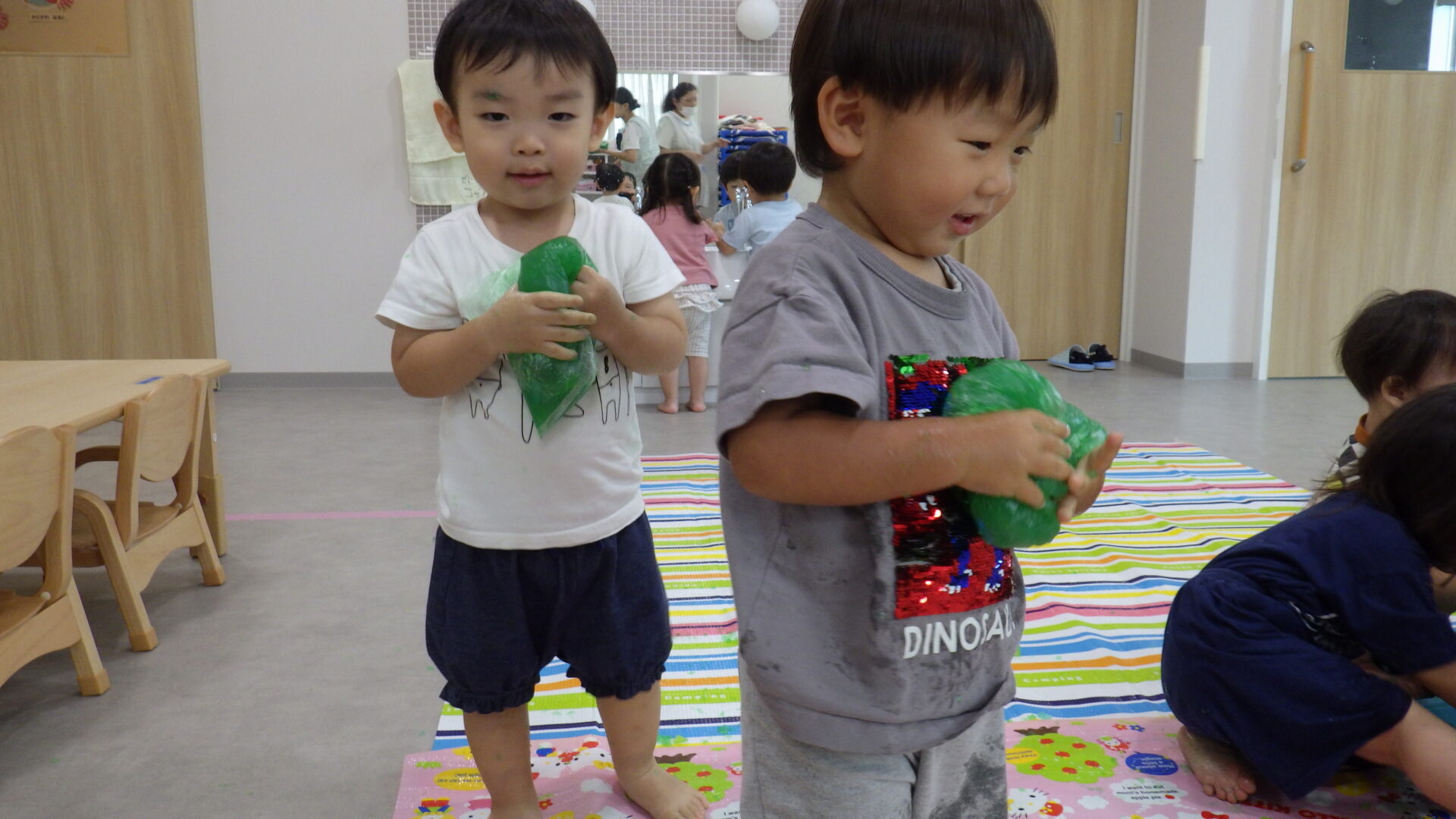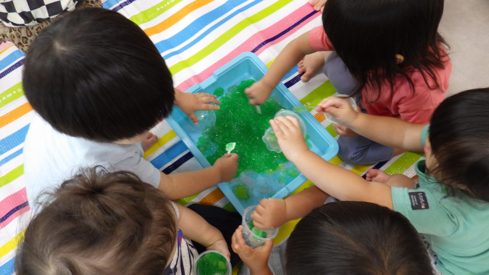 大きな入れ物に寒天を移して、両手で感触を楽しみますよ!