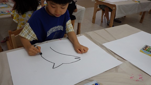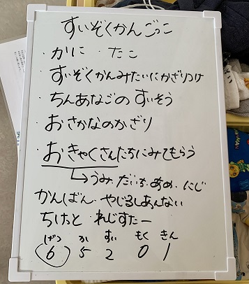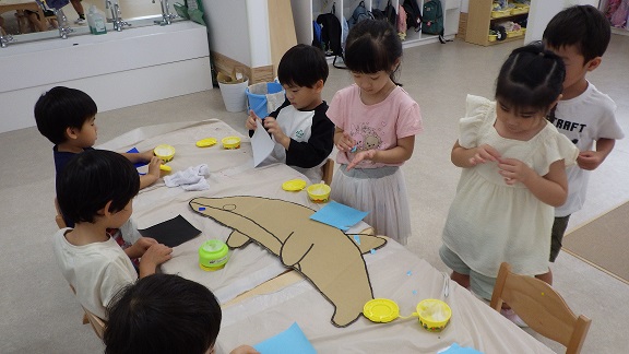 お泊り保育での水族館見学の経験をもとに、そら・くじら組では手作り水族館「くじらわあるど」をオープンすることになりました☆