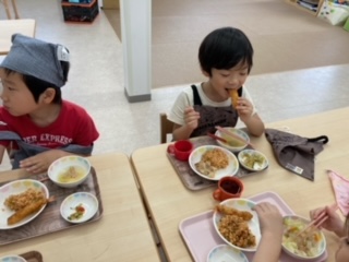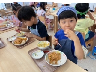 にじ・そら・くじら組さんは、自分たちで飾り付けをしていただきました。(スイカは昨日収穫したものです。)とっても甘かったですよ!
