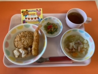 サラダのお皿はあっという間に空っぽ。(トマトは昨日収穫したトマトです。)しかし、中でもエビフライが人気でした!