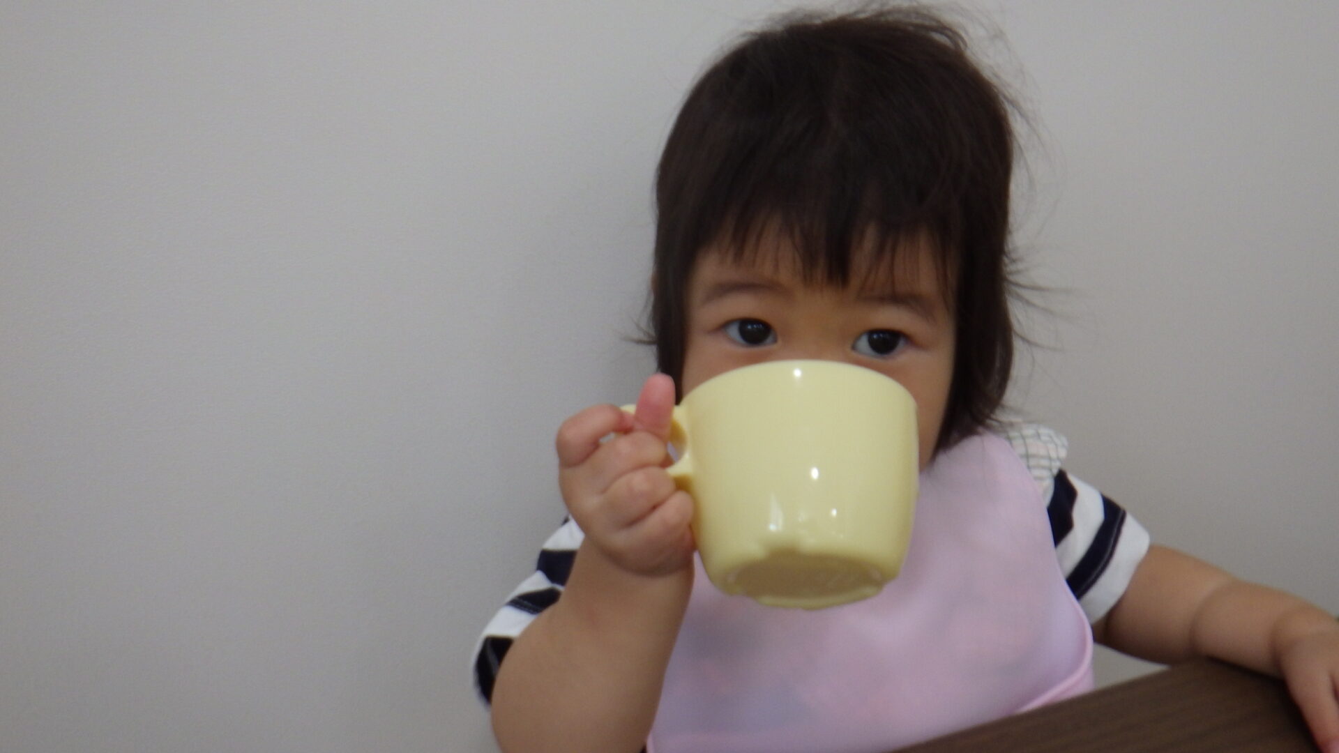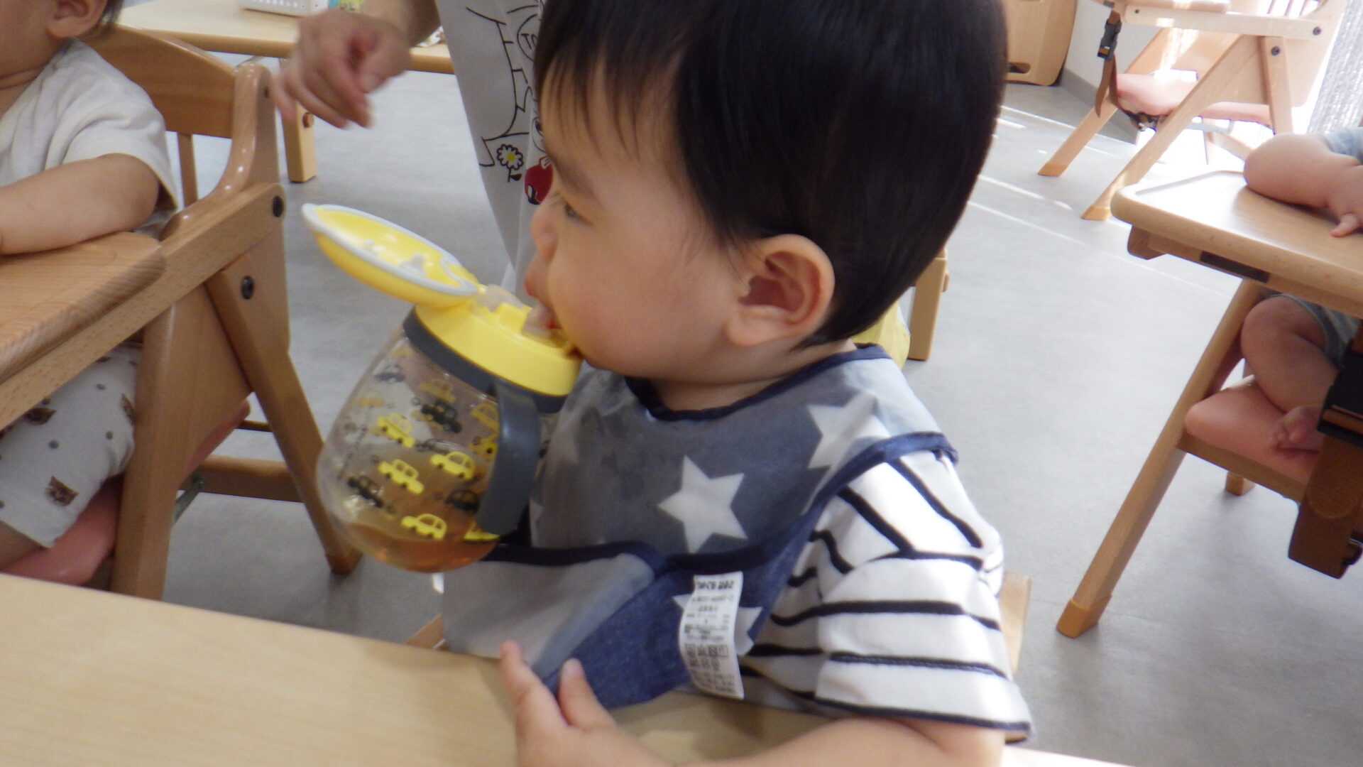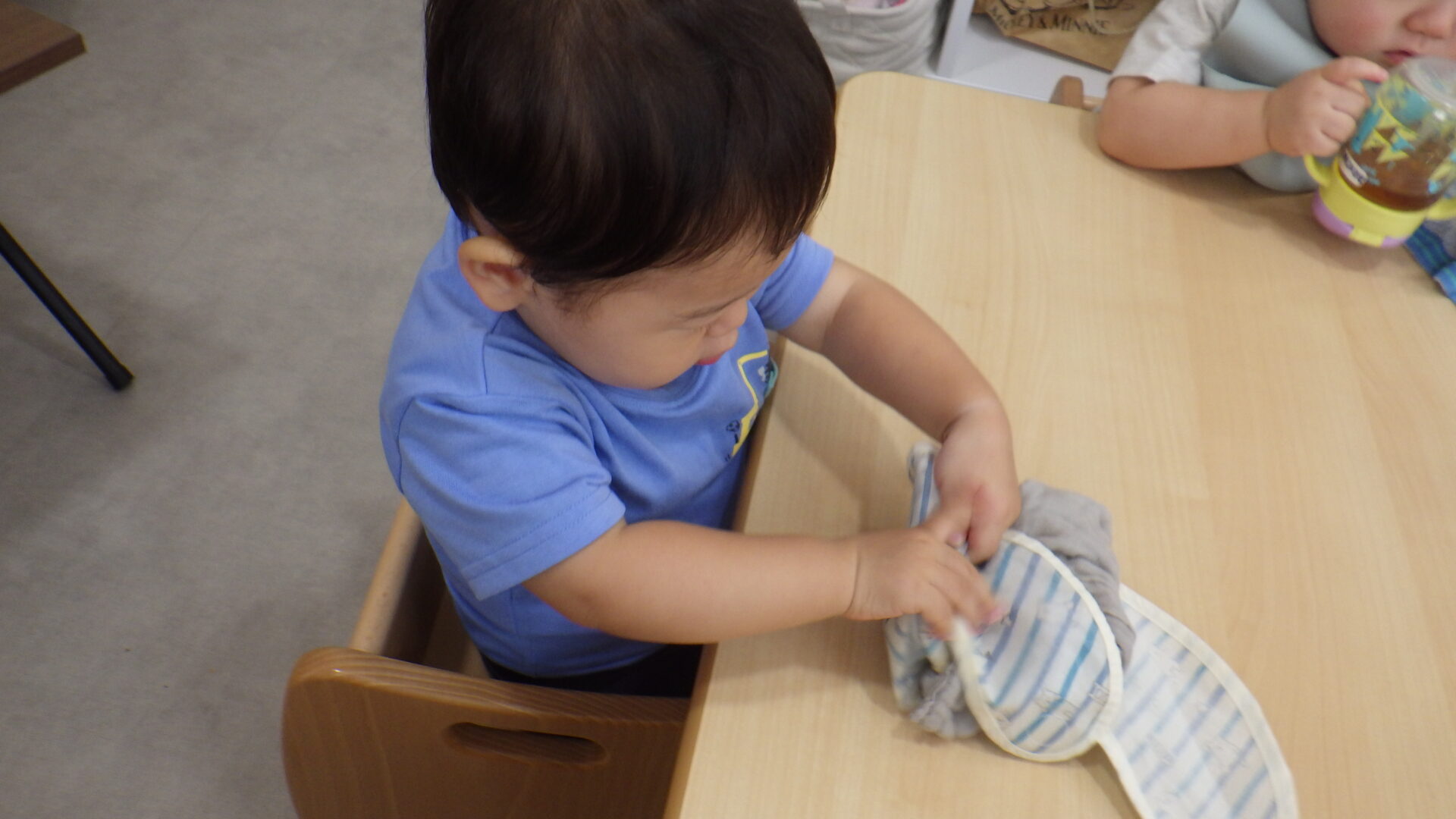 飲み終わったら、自分でエプロンを外し、たたみ始める子もいました!!びっくりした私たちは、声をそろえ「すごい!!」と、一言。「すごいね~」とほめてもらった子どもたちは幸せです。この「すごいね~」が「自信」へとつながります。