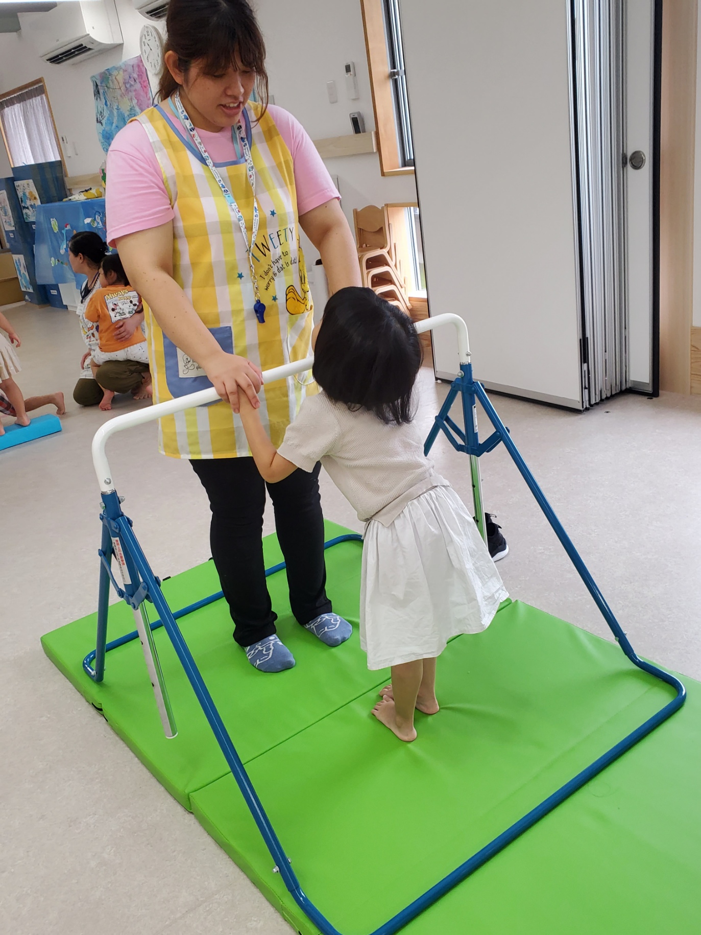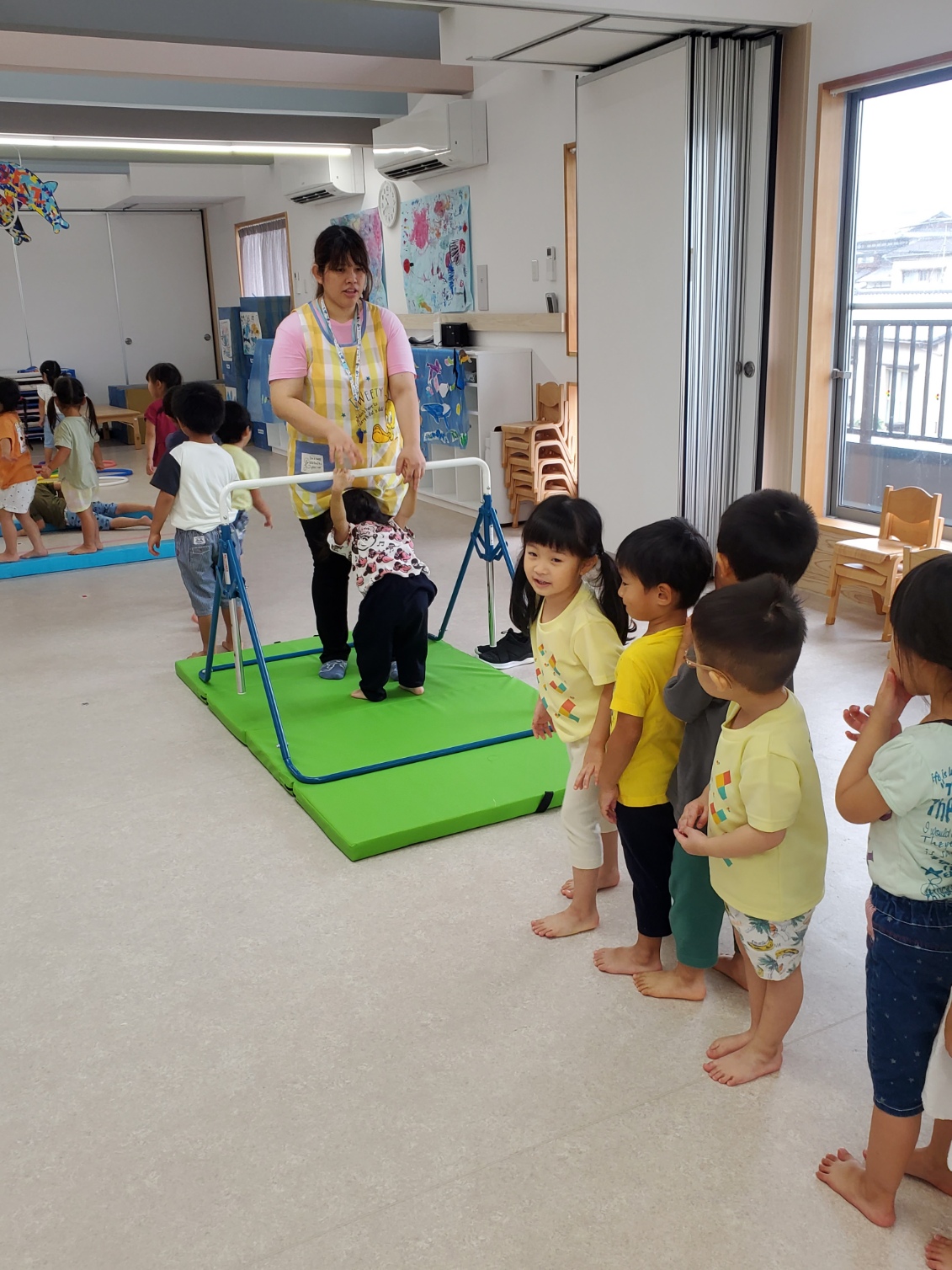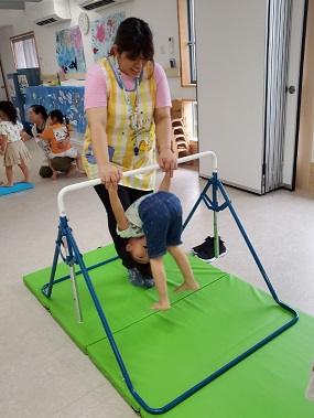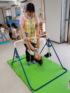 にじぐみさんは鉄棒を頑張っていました。
