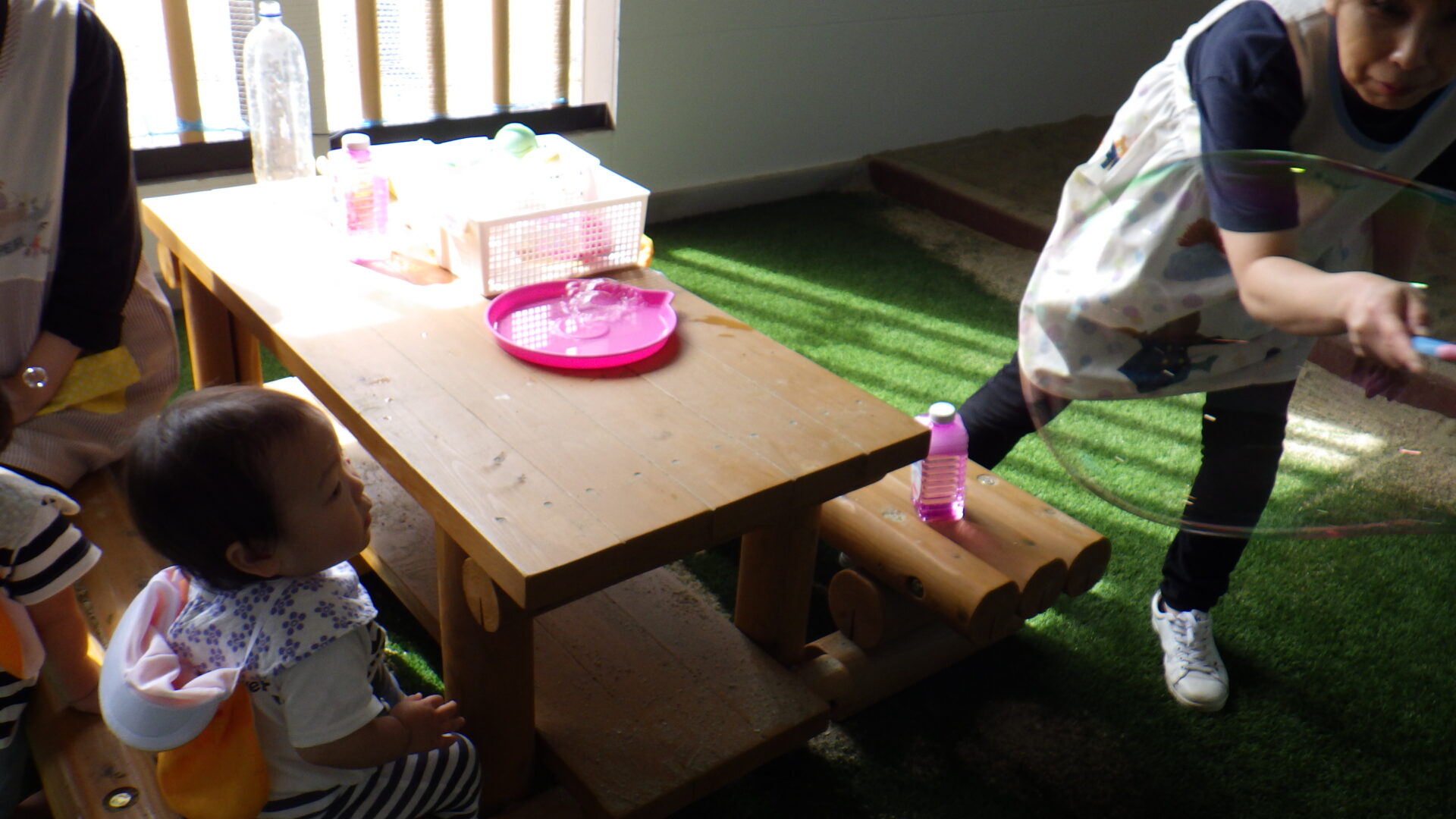 興味津々に見つめるシャボン玉、「おお~シャボン玉が、だんだん大きくなってる~」食い入るように、期待感を持って見つめます。