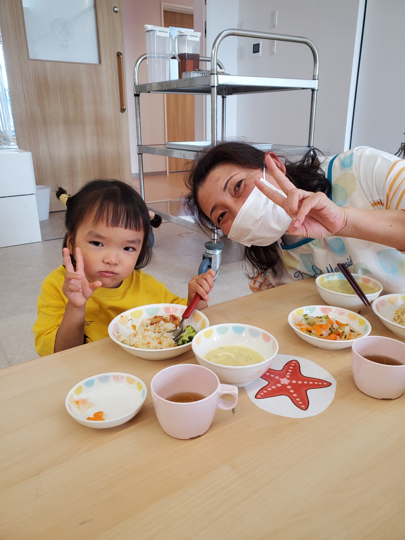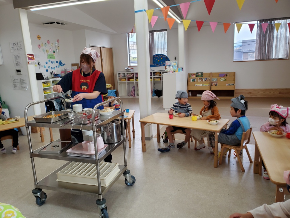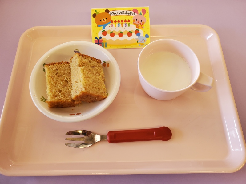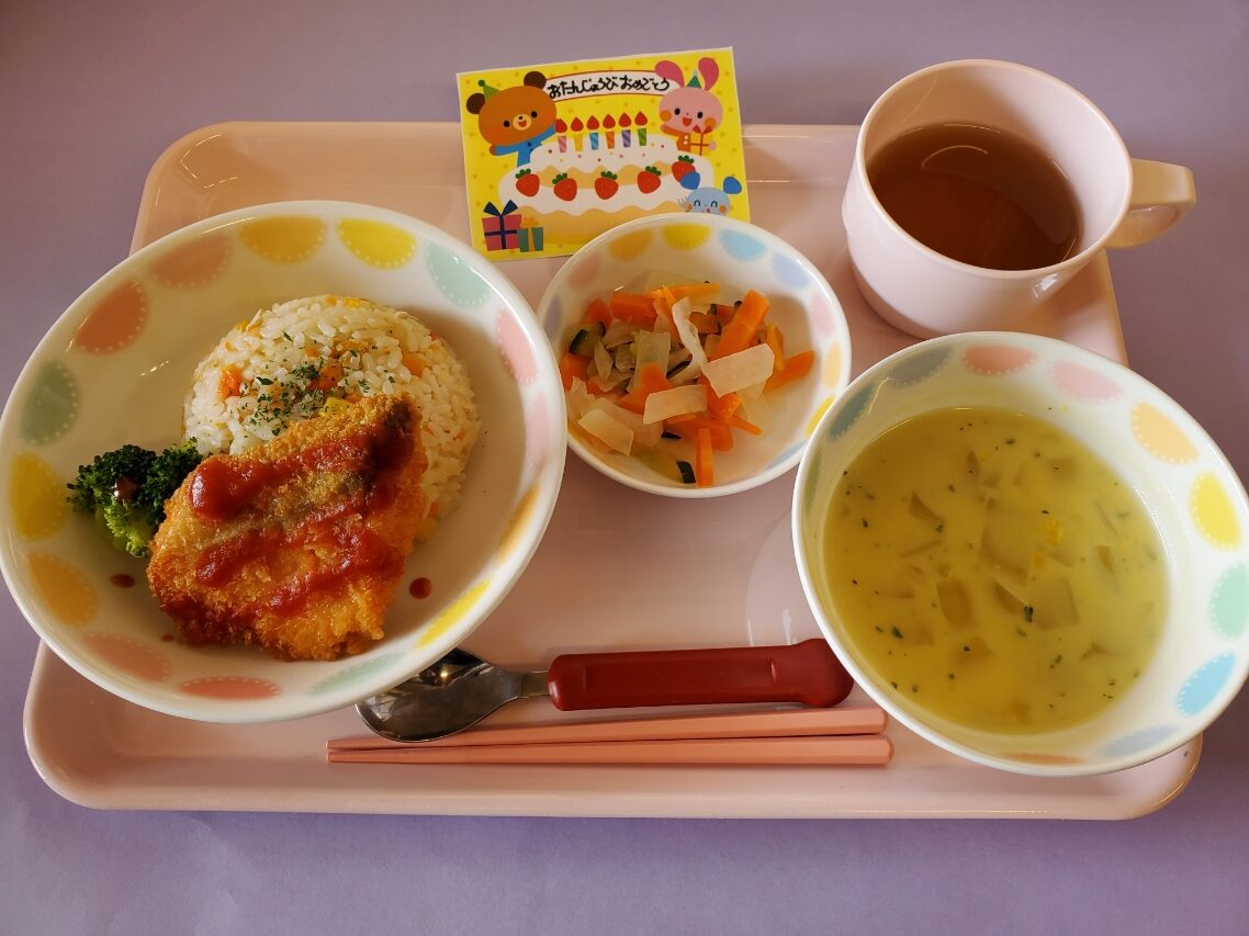 2023.10.27 お知らせ 10月27日(金)お誕生会メニュー コーンツナピラフ 鮭フライ コーンスープ 短冊サラダ 牛乳 イチゴのパウンドケーキ 今日はテーブルを丸く並べ、誕生児さんを祝う 食事会にしました。 おめでとう! 先生と一緒、お友達と一緒。 一覧へ戻る