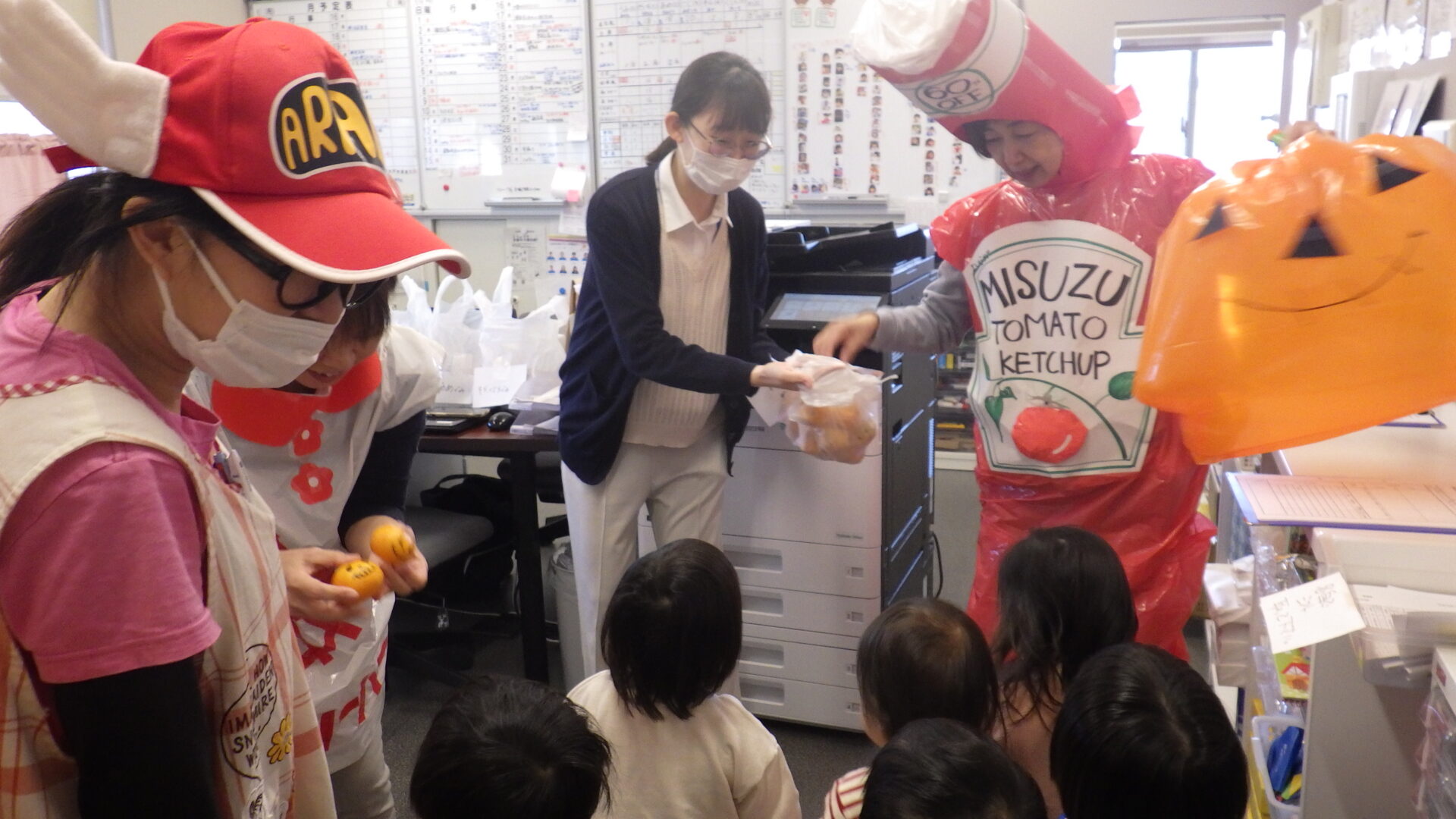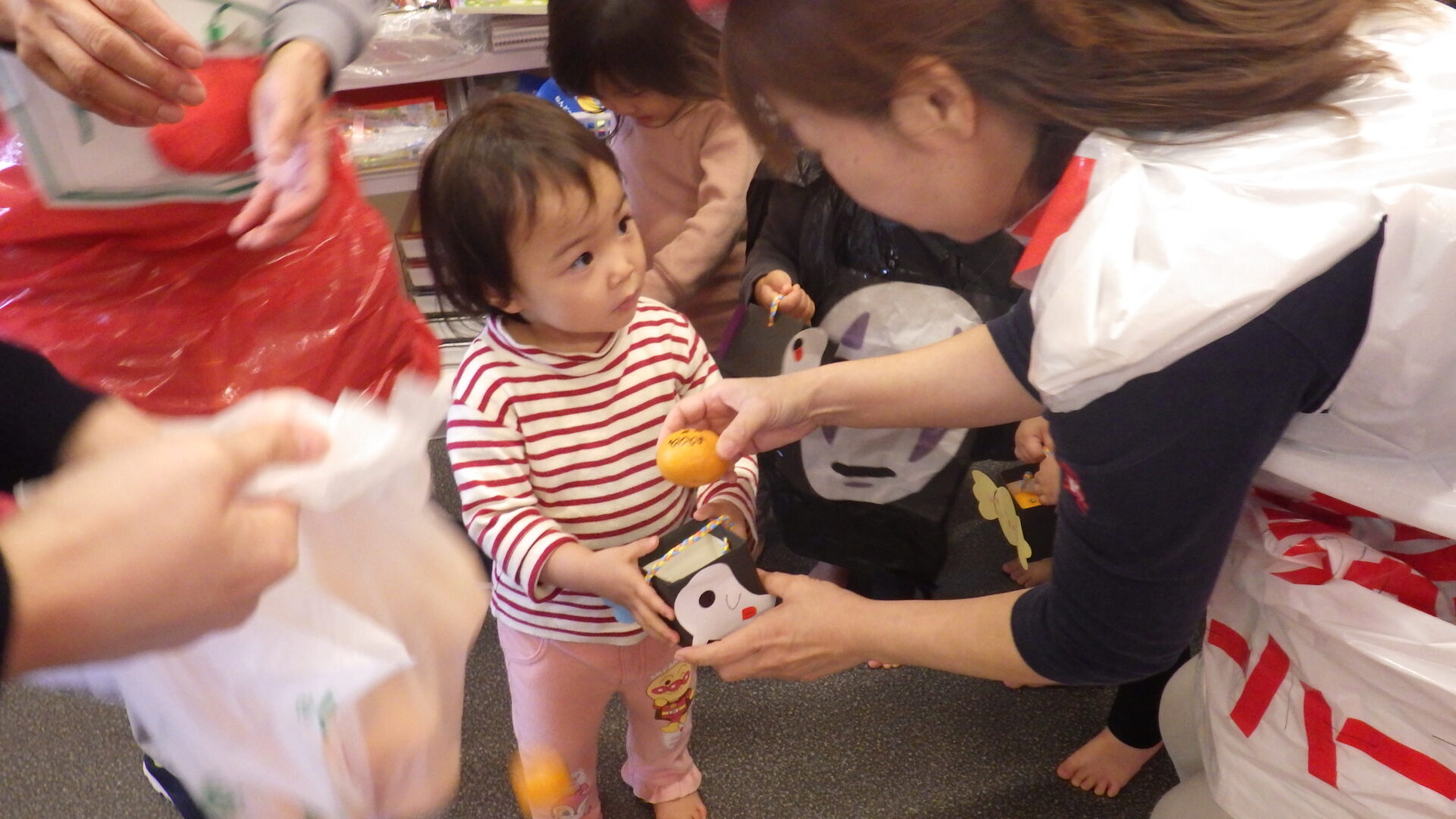 園長先生たちがお菓子の代わりのみかんを持って
