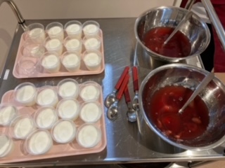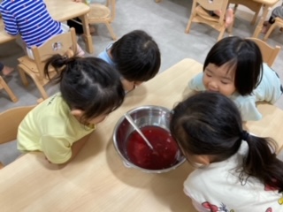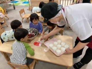 今日は、午後のおやつ(フルーチェ)つくりをしました。先日、だいち組さんが食育(きのこ)をしていたことを知っているあめ組さんは、今度は自分たちの番が来て、とても楽しみにしていました。