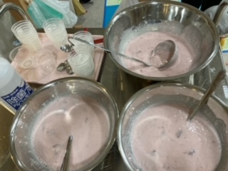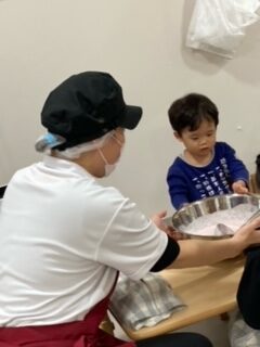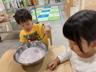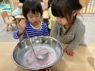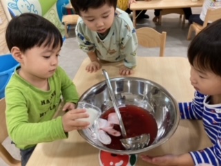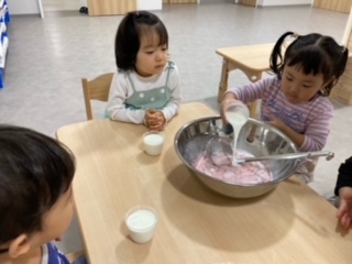 こちらのお友だちも牛乳を入れて混ぜて混ぜて、順番順番。(自分の番が来るまでワクワクするお友だち)