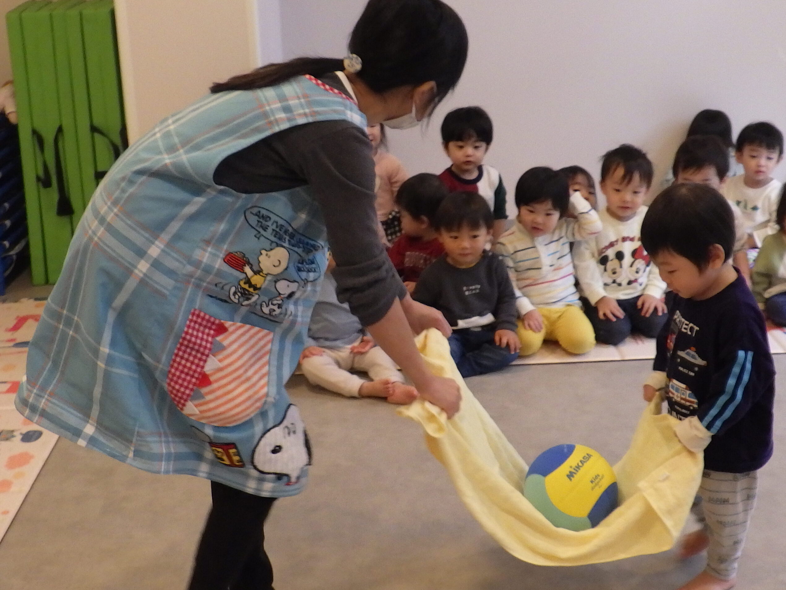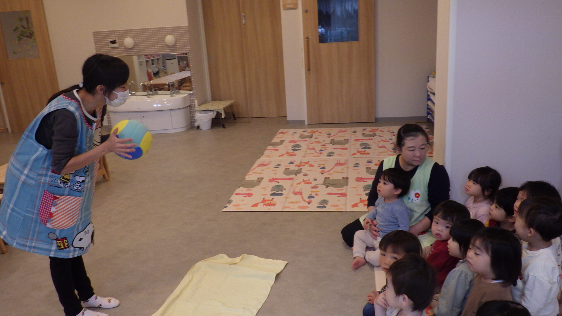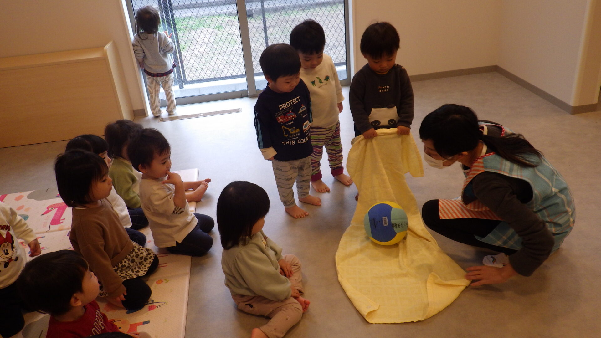 「タオルとボールを使ってあそびましょ~」どんな遊びができるか楽しみですね。