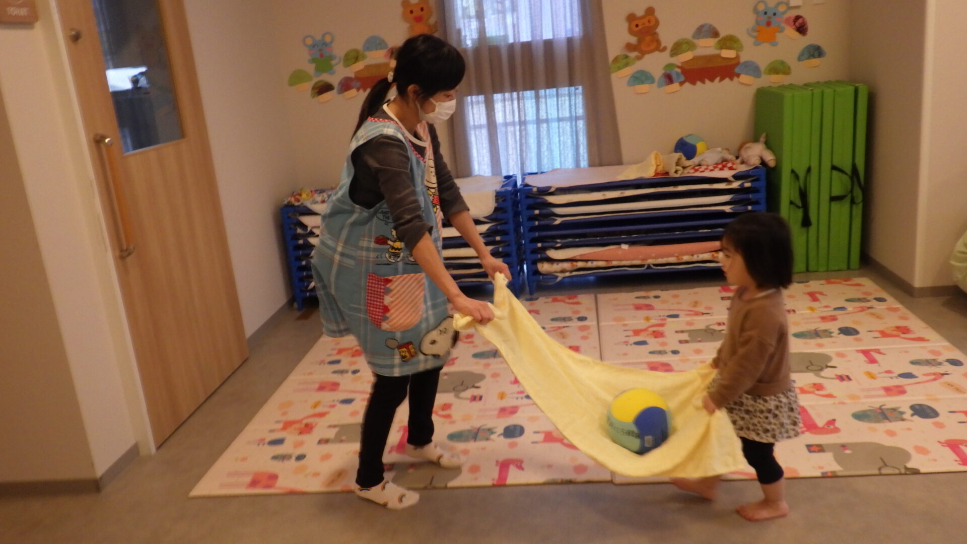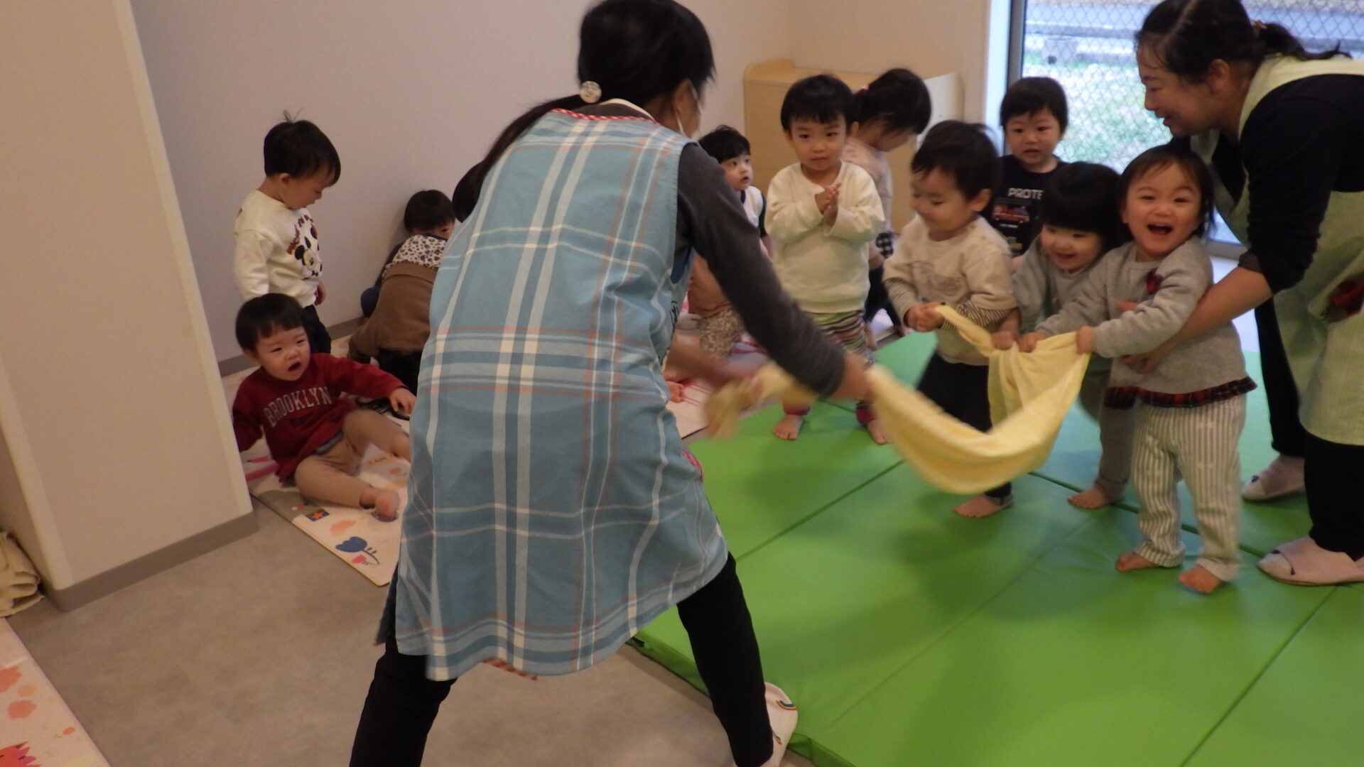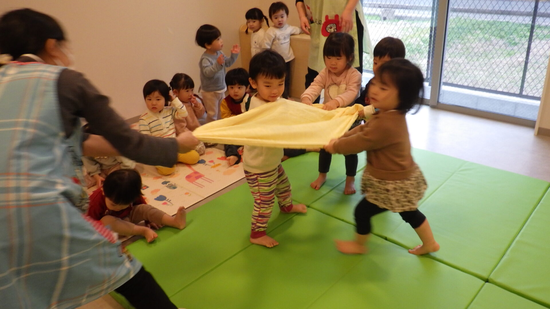タオルを使ったシンプルな遊びの中でも、触る、握る、引っぱる、など、手指の感覚を刺激し、運動発達を促進する効果のある、いろんなあそびができますね。共に楽しく遊ぶ、保育園だからできるんですね。