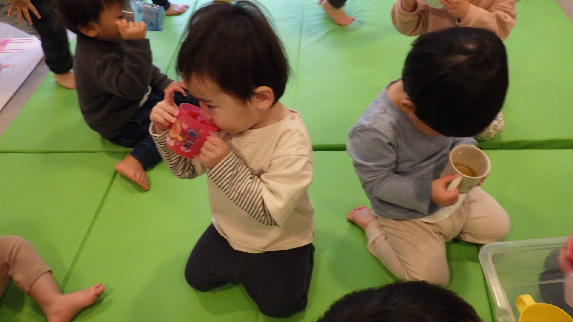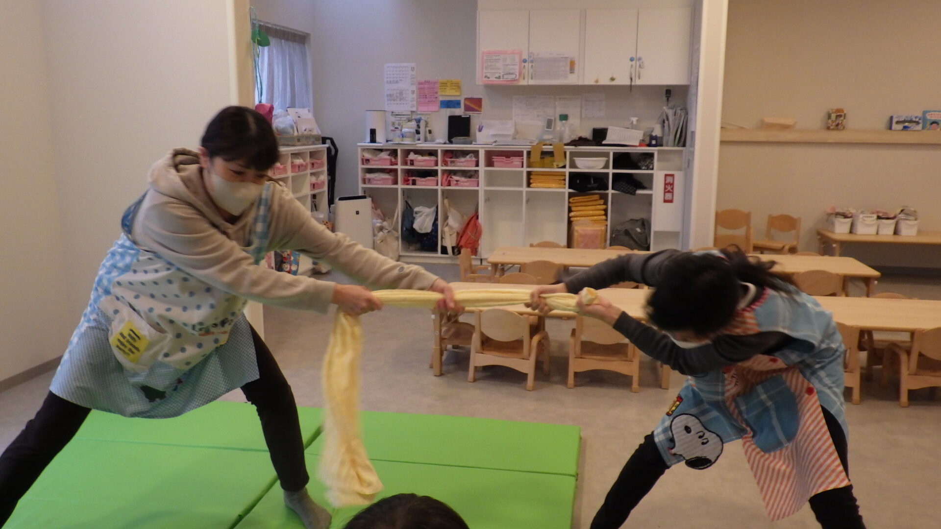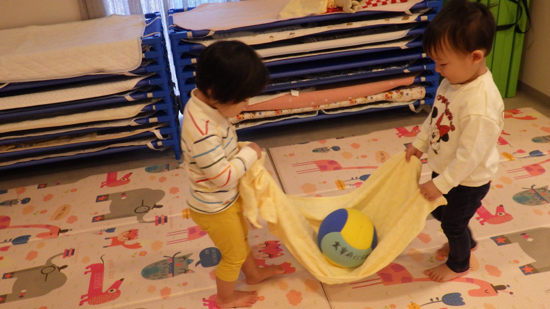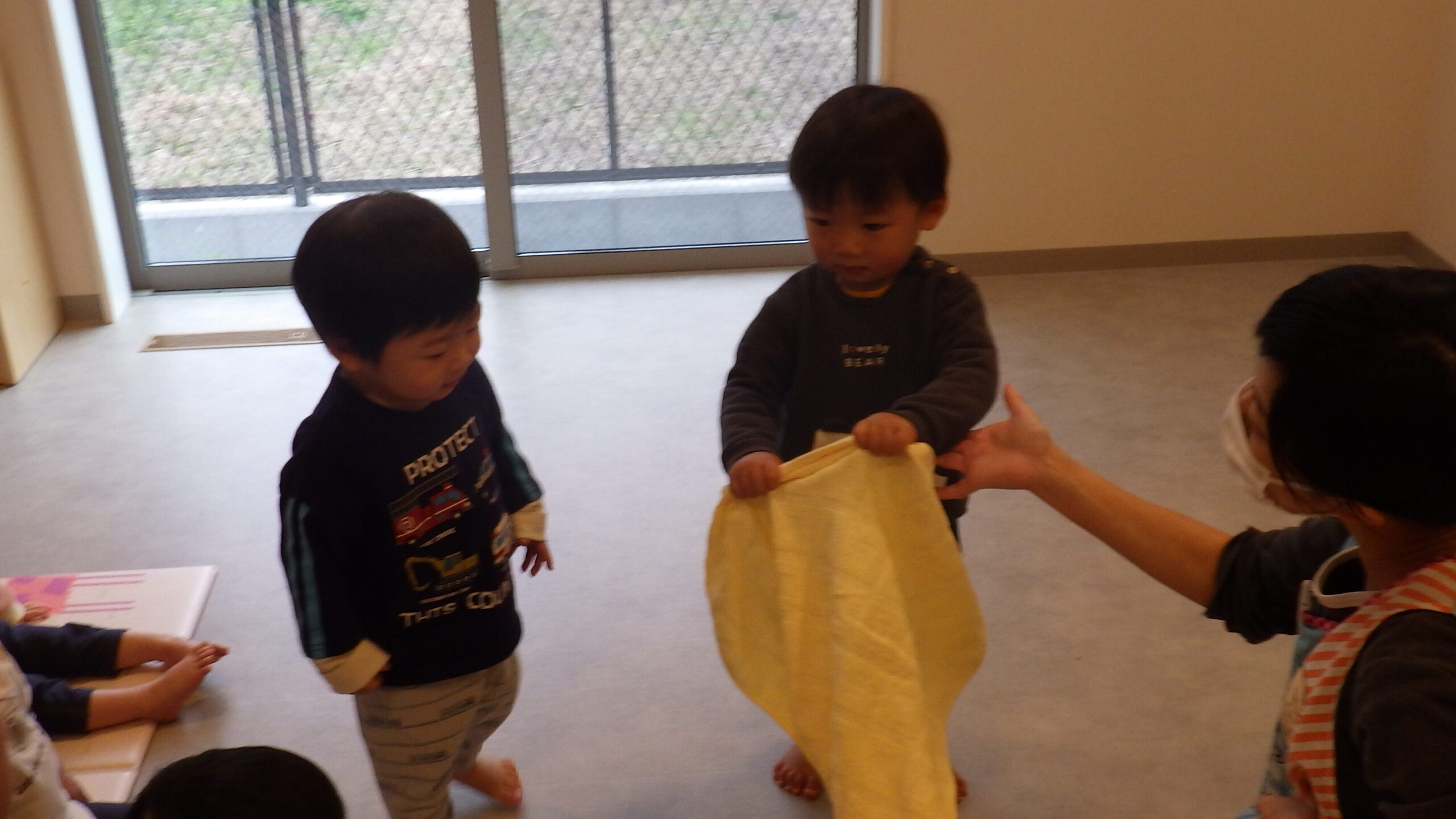 タオルを使ったシンプルな遊びの中でも、触る、握る、引っぱる、など、手指の感覚を刺激し、運動発達を促進する効果のある、いろんなあそびができますね。共に楽しく遊ぶ、保育園だからできるんですね。