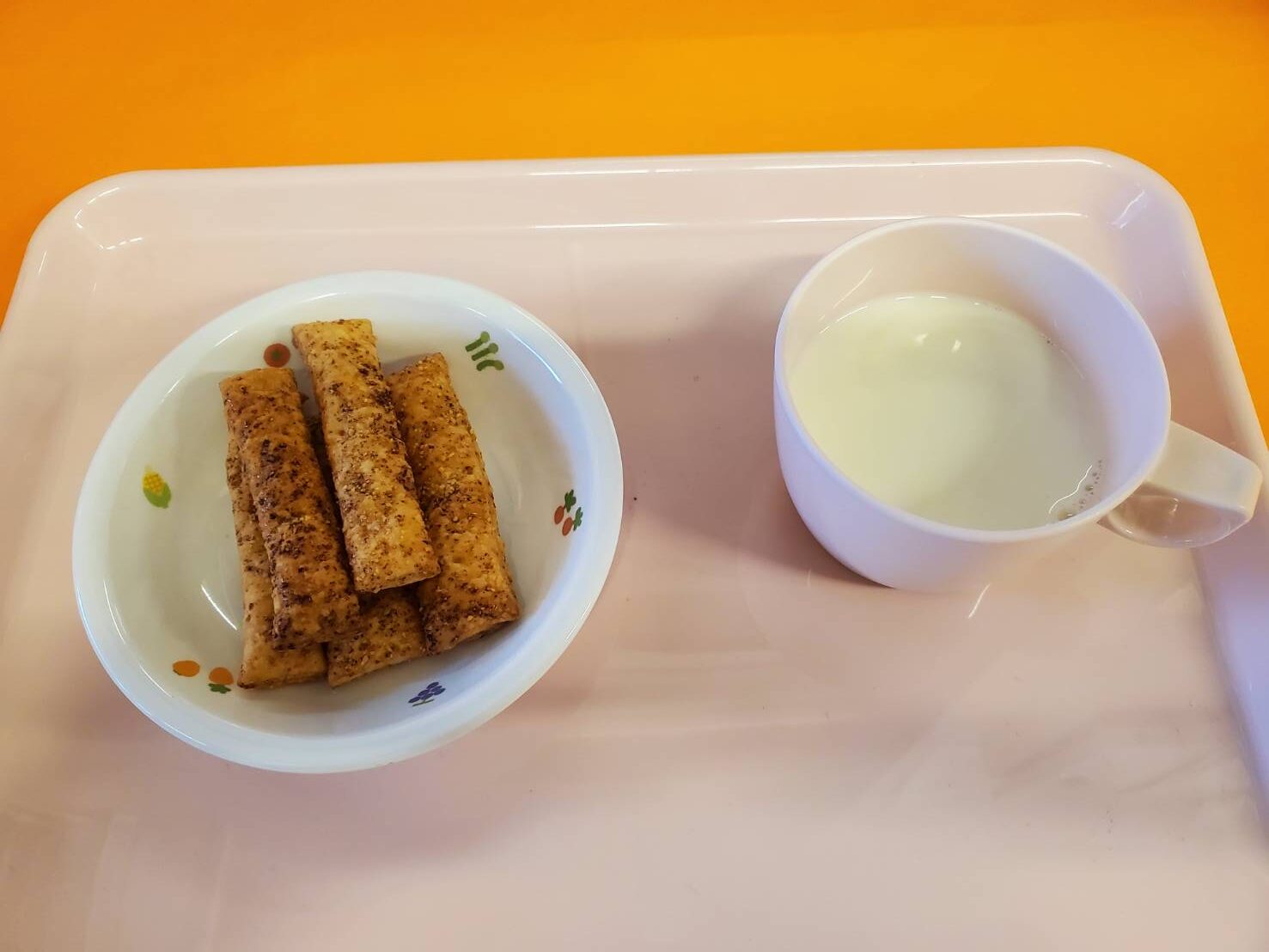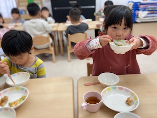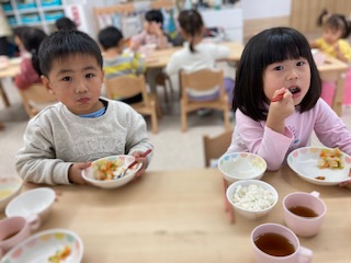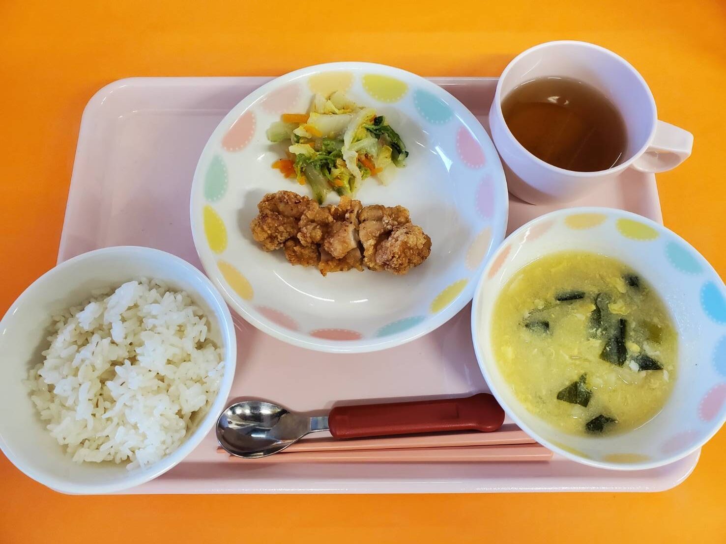 2023.11.30 お知らせ 11月30日(木)献立 麦ごはん かきたま汁 鶏の竜田揚げ 白菜のごま和え 牛乳 チーズシュガーパイ モリモリ食べるにじ組さん(3歳児)。 お茶碗をしっかり持って!「おいしい!」と言って食べていました。 一覧へ戻る