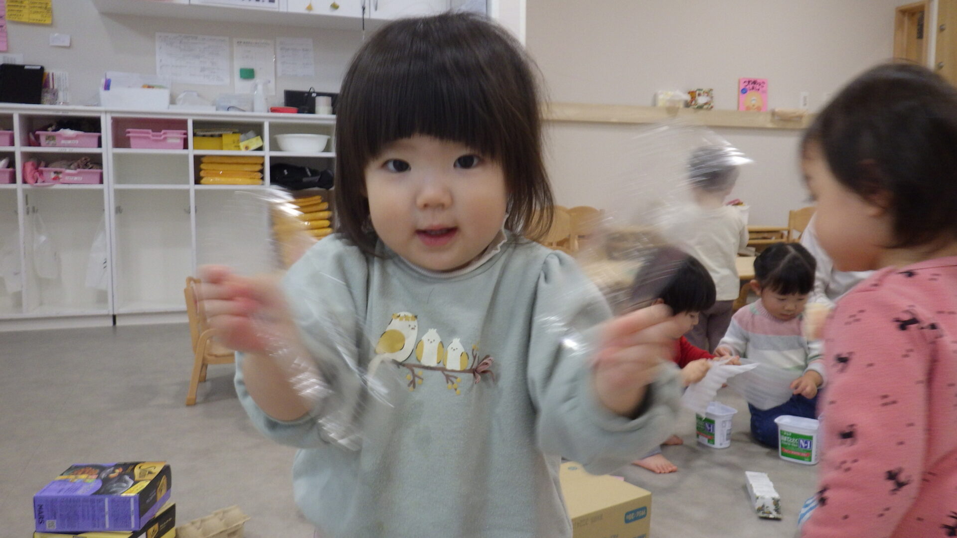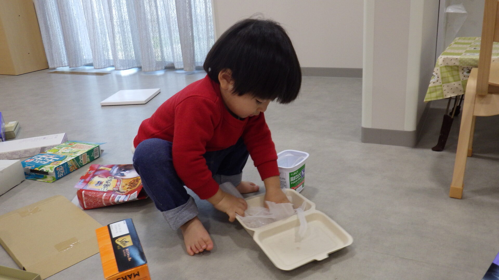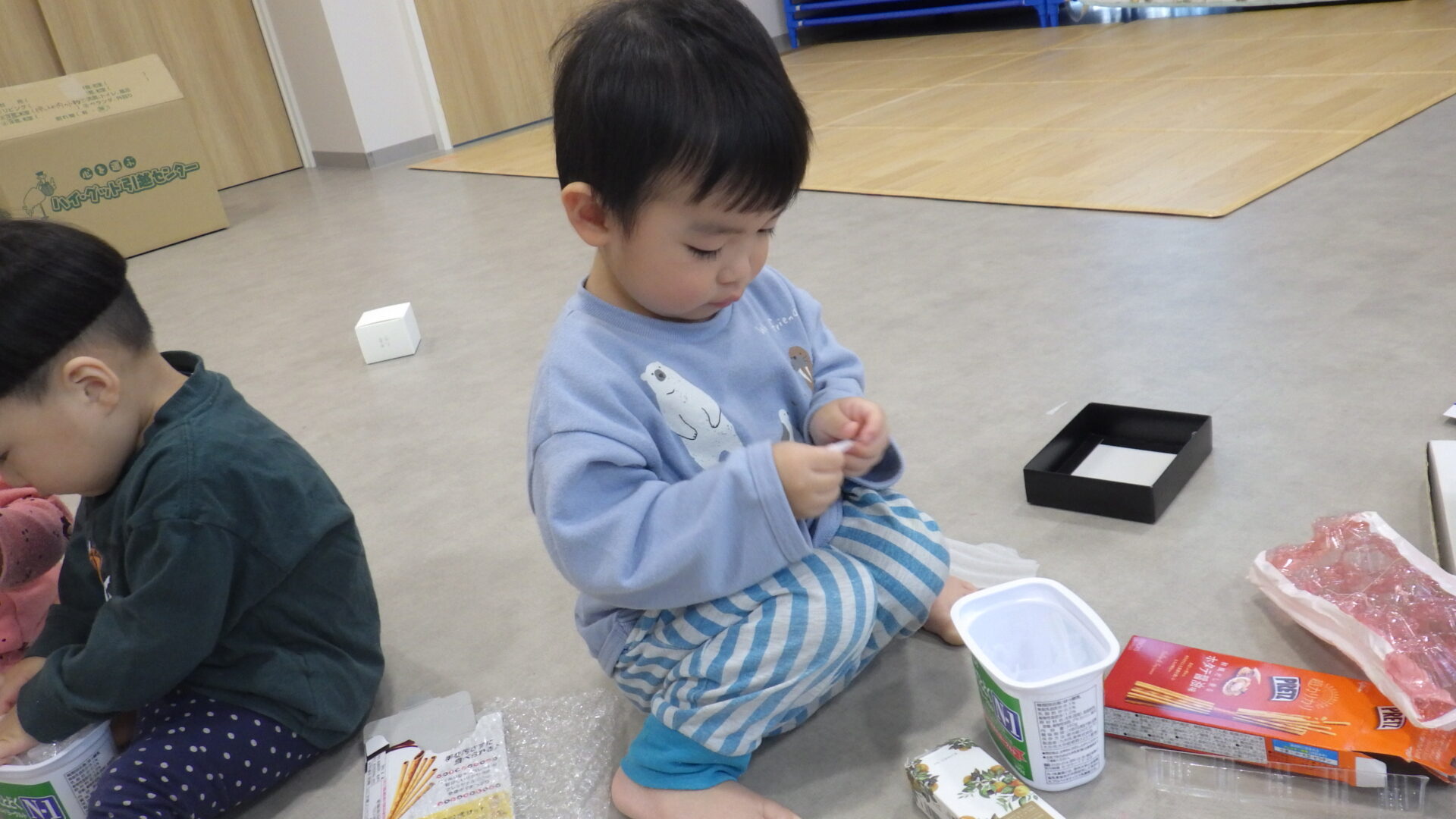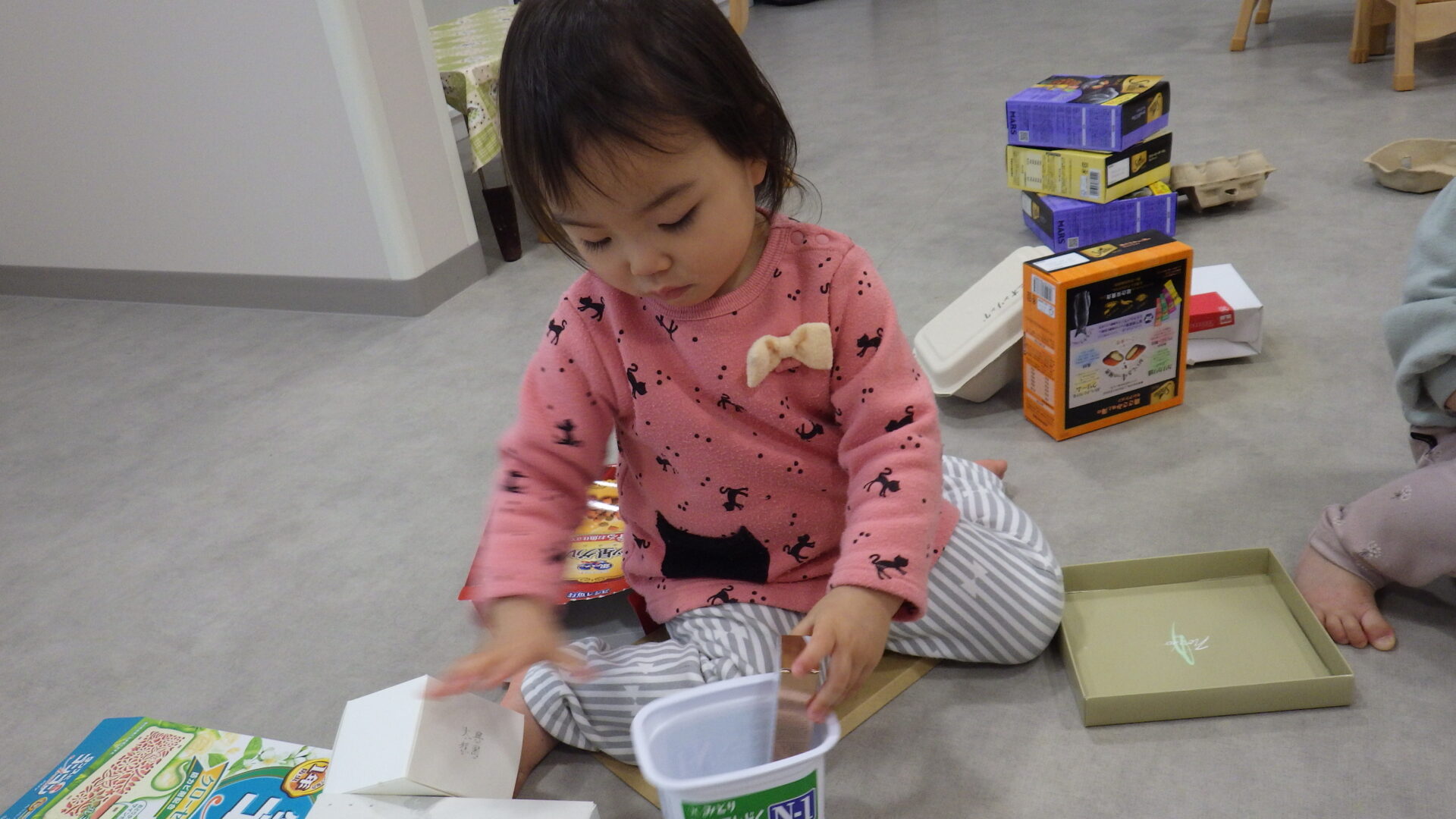 たくさんの箱や素材で遊んだだいち組(1歳児)さん。