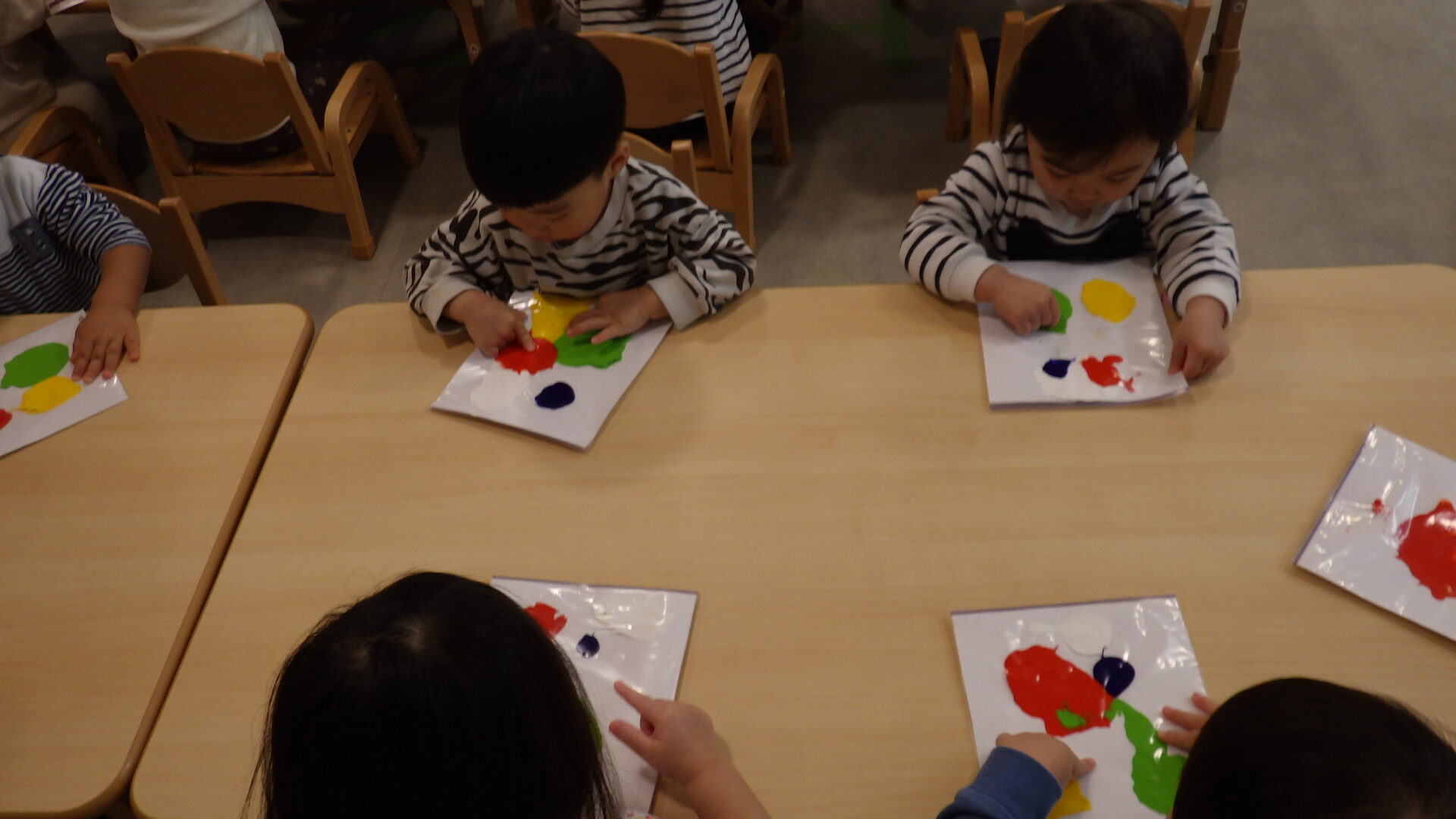 手を開いて指先に力を入れながらフィンガーペインティングを楽しんでいますね!