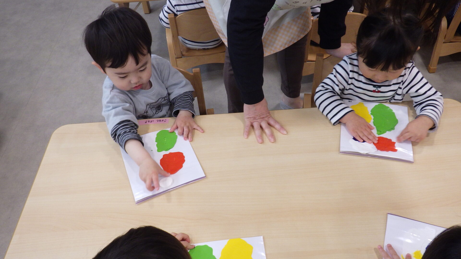 絵の具が広がっていく感触が楽しくて、何度も指先を使ってのばそうとする姿がみられます。