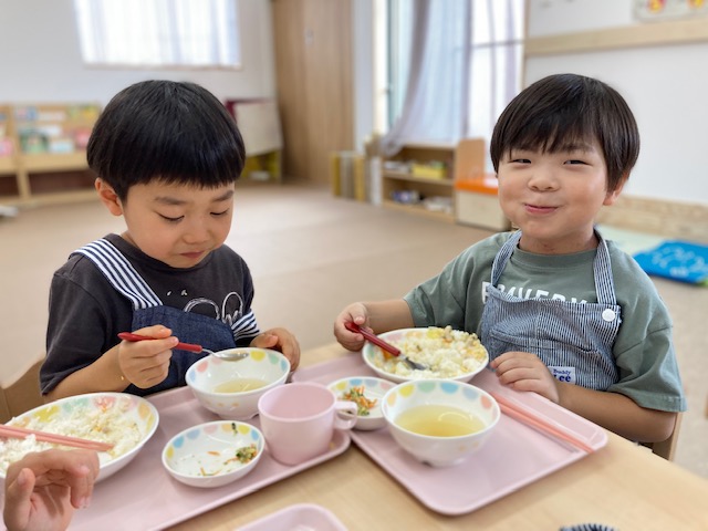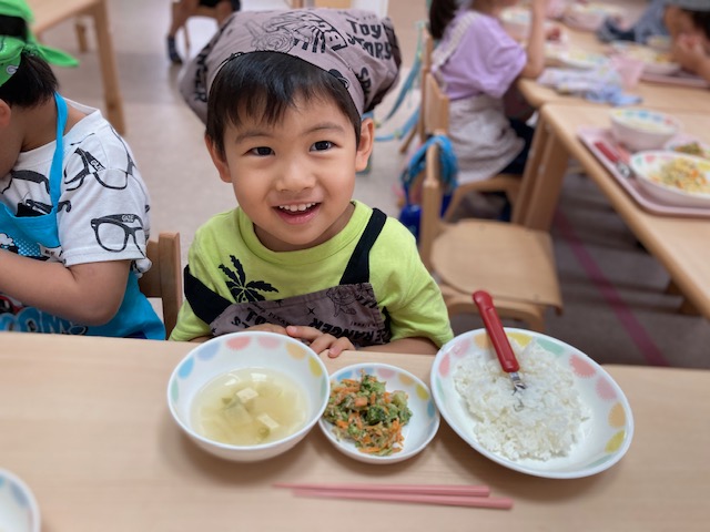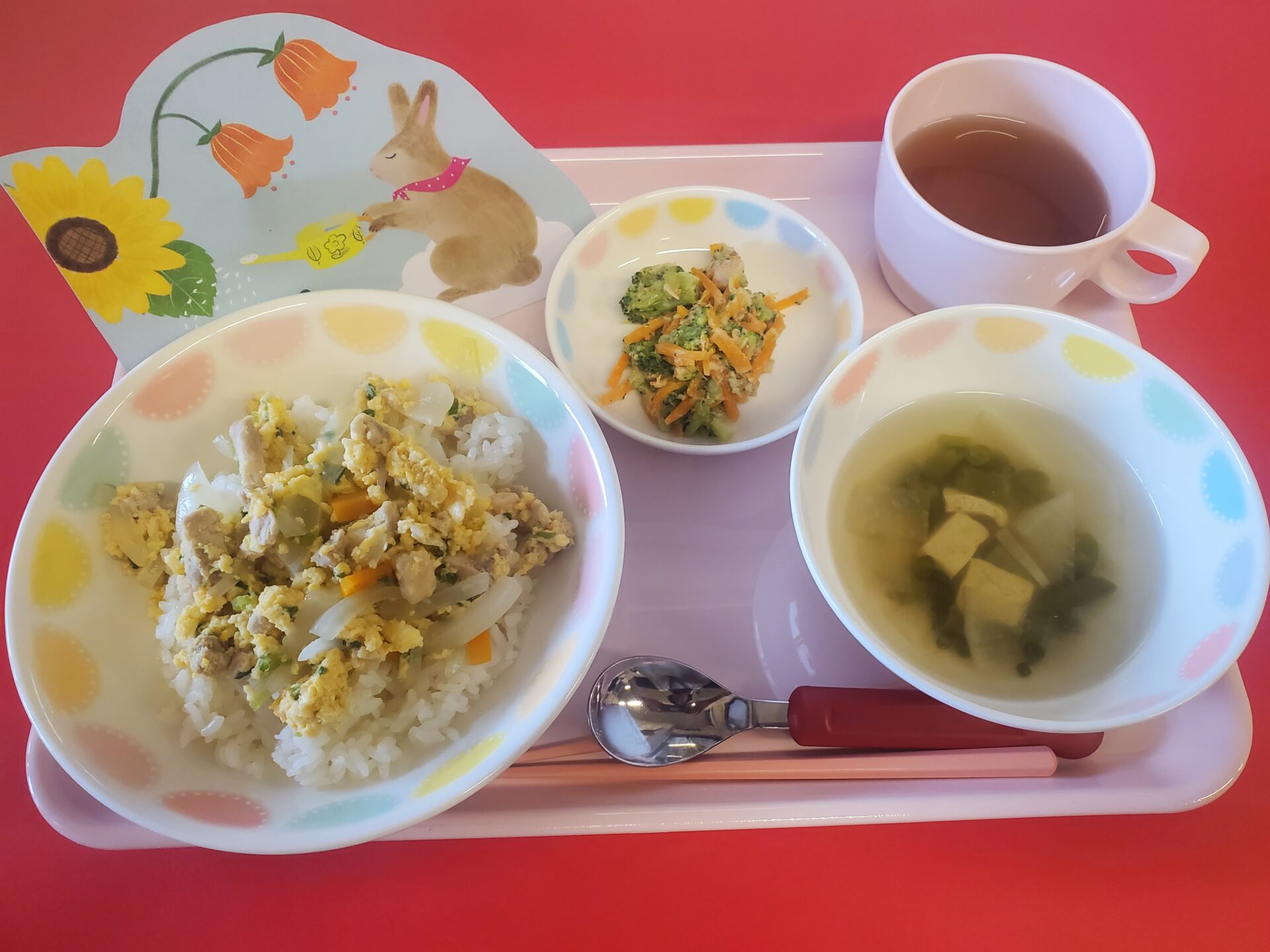 2023.06.21 給食献立 うまかランチ 6月21日(水曜日)今日の給食 親子丼 さやえんどうと大根のすまし汁 ごまだれサラダ 牛乳 りんごゼリー 親子丼とってもおいしいね。 だーいすき いただきます! 一覧へ戻る