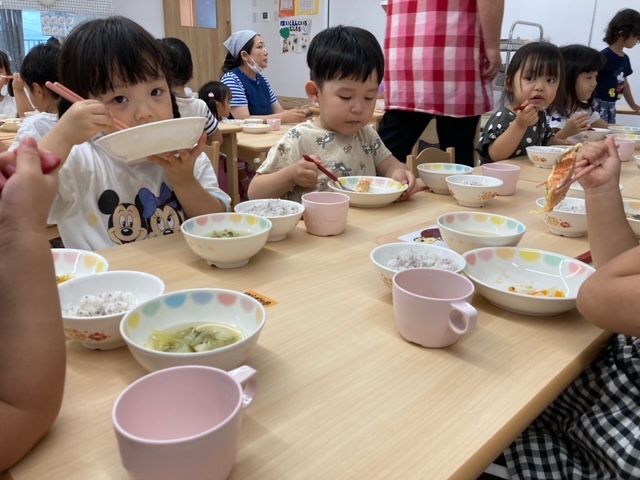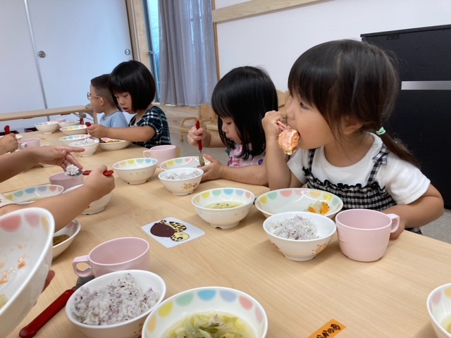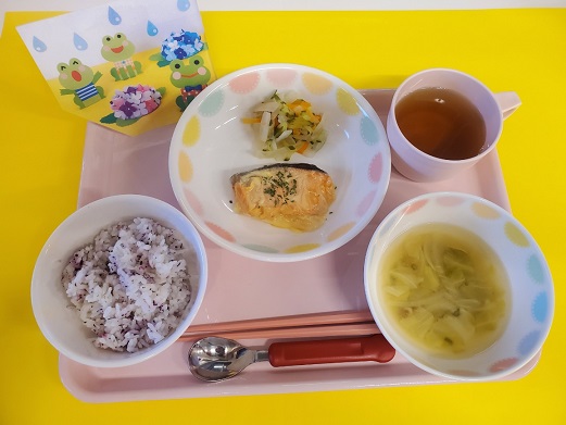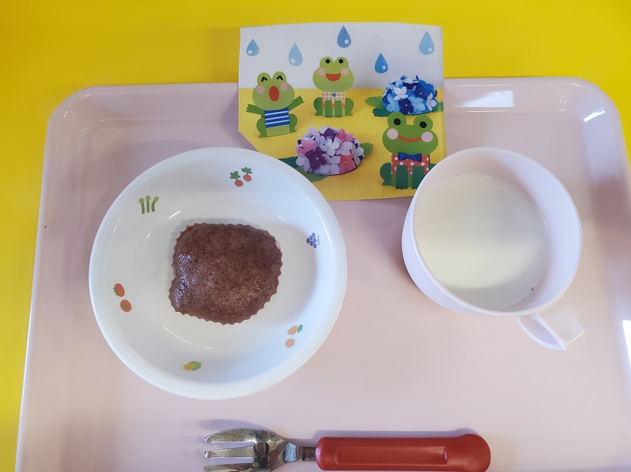 2023.06.30 給食献立 うまかランチ 6月30日(金曜日)本日のメニュー ゆかりごはん 味噌汁 鮭のチーズ焼き 短冊サラダ 牛乳 ココアケーキ にじ組(3歳児)給食の様子 おさかな大好き 一覧へ戻る