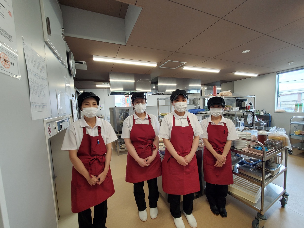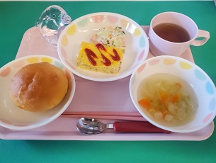 2023.07.11 給食献立 うまかランチ 7月11日(火)の献立 ロールパン 野菜スープ ミートオムレツ ポテトサラダ わかめおにぎり 2階にある広い給食室。 くじら級においしい給食を作ってくれます。 一覧へ戻る