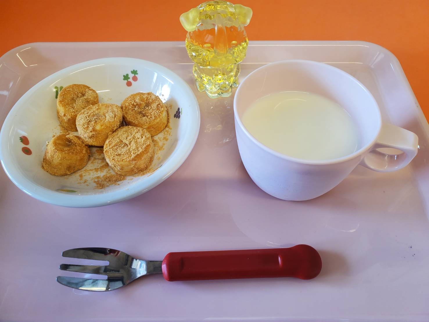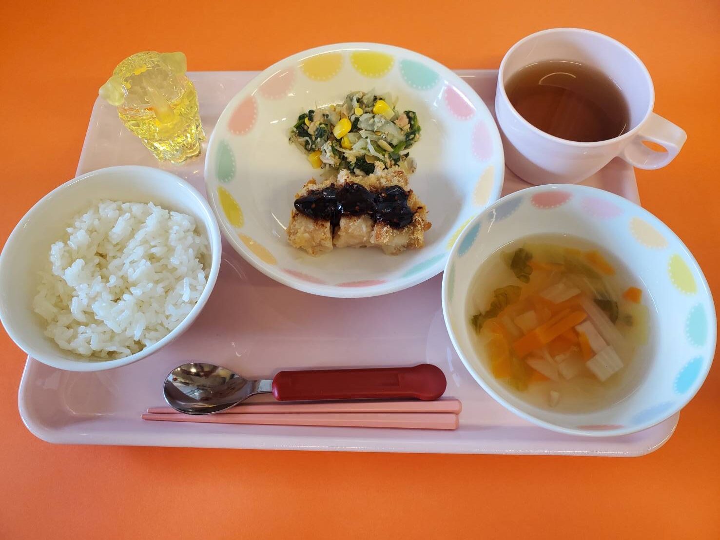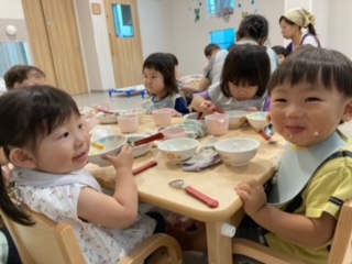 2023.07.12 給食献立 うまかランチ 7月12日(水)献立 ごはん ハムと白菜のスープ 味噌カツ かみかみサラダ 牛乳 きな粉バナナ 保「おいしいですかぁ?」 子「おいしいですよ~」 (だいち組) 「はいどうぞ!」 一覧へ戻る