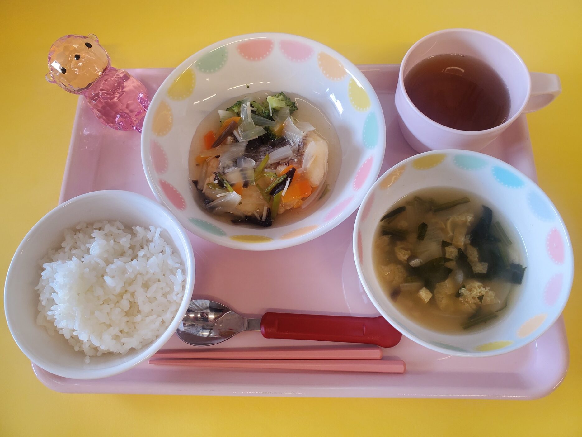 2023.07.13 給食献立 うまかランチ 7月13日(木)献立 ごはん ほうれんそうの味噌汁 魚の野菜あんかけ ゆでブロッコリー 牛乳 ココア蒸しパン みんなで食べたら楽しいね、おいしいね。 お魚は大好き おいしいね。 一覧へ戻る