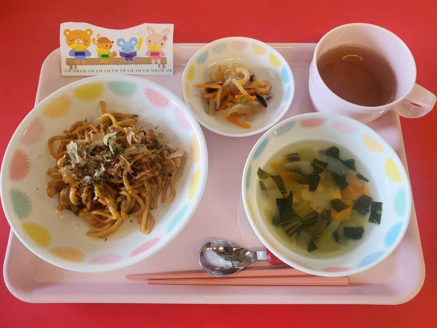 2023.07.20 給食献立 うまかランチ 7月20日(木)献立 焼きそば 野菜スープ 切り干し大根の煮つけ ※本日は日田焼きそば 牛乳 やせうま風 ※大分県のお菓子 「焼きそば、おいしいね~」 お友だち同士、顔を見合わせて会話がはずみます。 一覧へ戻る