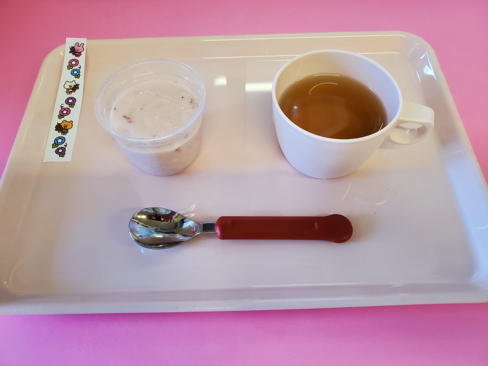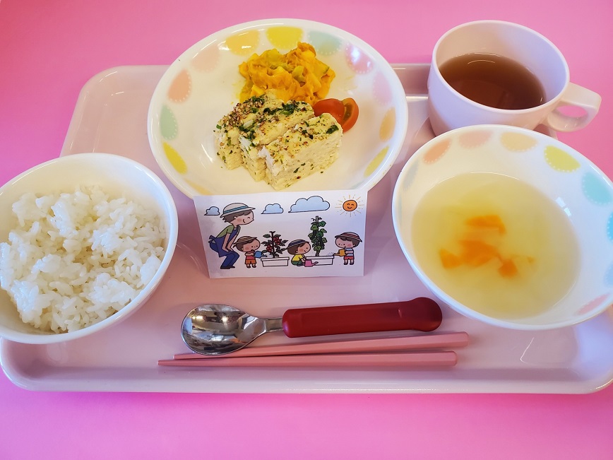 2023.08.03 給食献立 うまかランチ 8月3日献立 ごはん 玉ねぎのスープ 松風焼き かぼちゃサラダ 今日は保育園で採れたトマトときゅうりが サラダのい入っています。 お茶 フルーチェ 一覧へ戻る