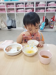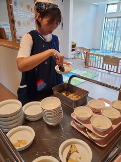 0・1・2歳児は、ゆったりと楽しんで食べる習慣を身につける時期です。離乳食から、完了食へと移るにつれ、多様な食材をよく噛んで味わいます。味覚が広がり、様々な味わいを経験します。また、お友達や保育者と一緒に食べる事の楽しさを感じ、食事という環境を大切にし、手づかみから、スプーンを使い、一人できちんと食べるように成長します。「おいしく食べて、元気に育ってね、」と毎日、心を込めて給食を提供してくれる環境と、受け取った給食を「今日も食べてくれるかな~お代わりいっぱいあるからね~」と見守る保育者と 良い環境の中での食事は守られているようです。