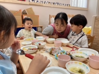 先生とのお話しは、楽しいひと時、おいしい給食を食べながら、会話も弾みます。
