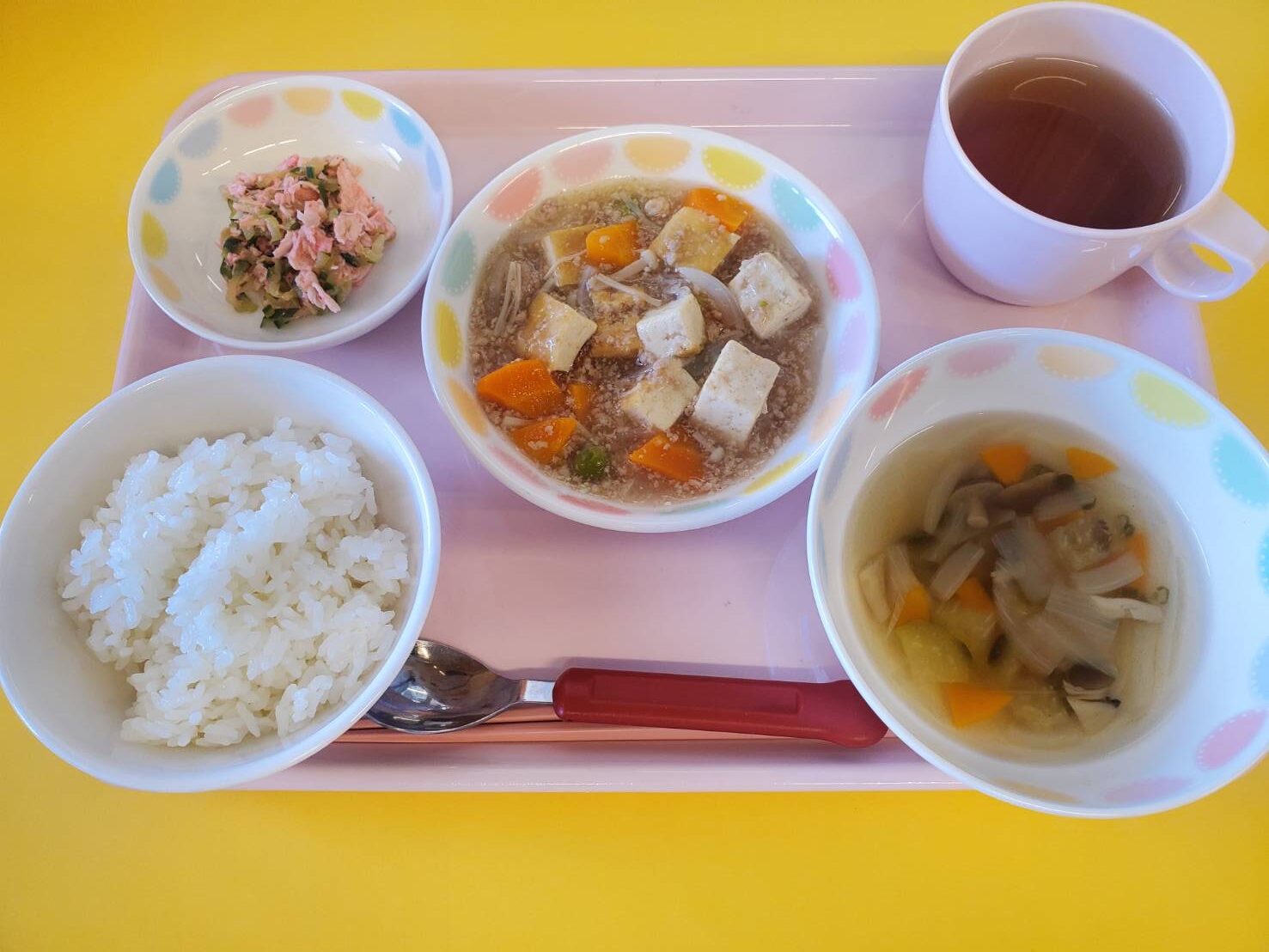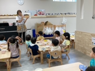 お話を聞いて待っている子どもたちです。準備が完了すると、みんなでいただきます!