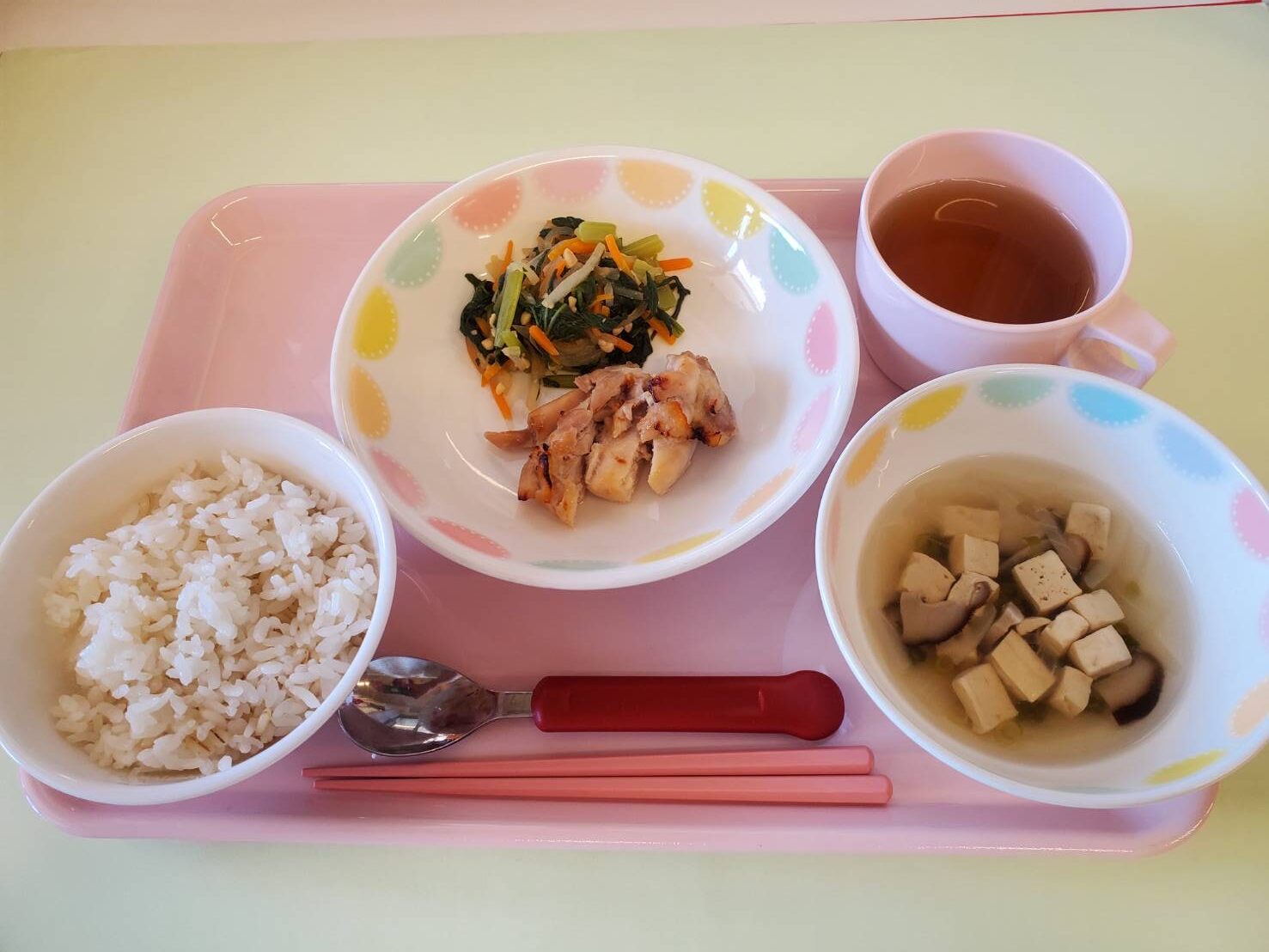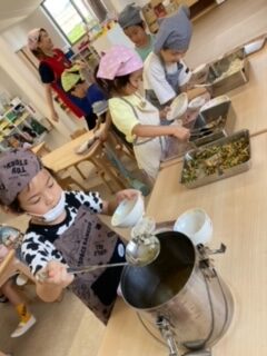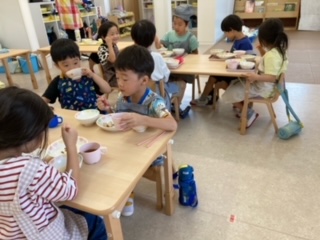 今日も自分で給食の準備に取り掛かります。みんなと食べる給食は、会話がはずみますね。急に質問。「今日のメニューで大好きなものは?」「ん~、このお肉かな。」「どうして?」「ん~、オレンジ味だから。」