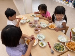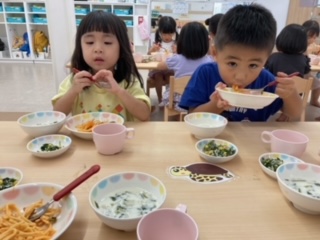 今日のにじぐみさん、給食を食べながら・・・「あのね~歯医者に行くよ!でも泣くと思う。でも4歳だから、やっぱり泣かない!」「え!僕も歯医者行ってるよ、でも4歳だから、泣かん!」