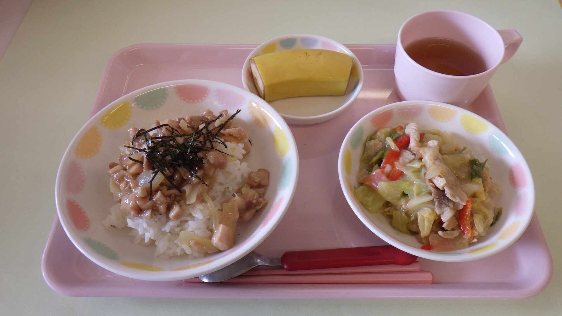 楽しい給食の時間!「このご飯大好き!」「デザートのバナナも楽しみだね!」お友だちとお喋りをしながら楽しく食べていますよ。