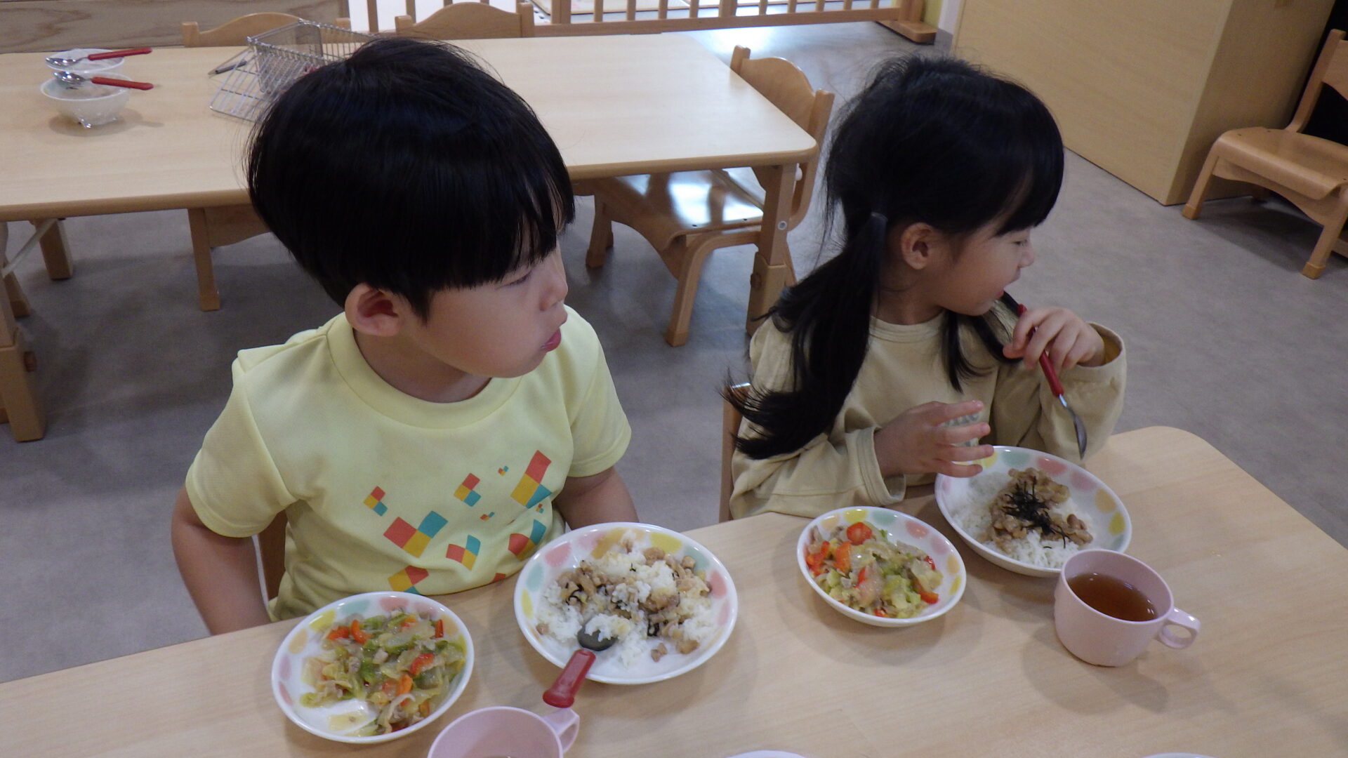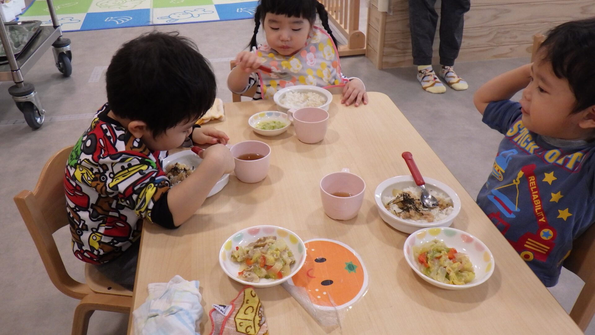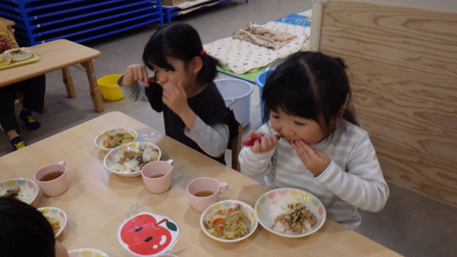 「いただきます」をした後すぐに食べ始める子ども達、一口食べて「美味しい!」の声が聞こえてきました。