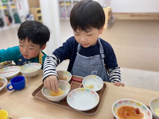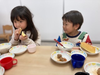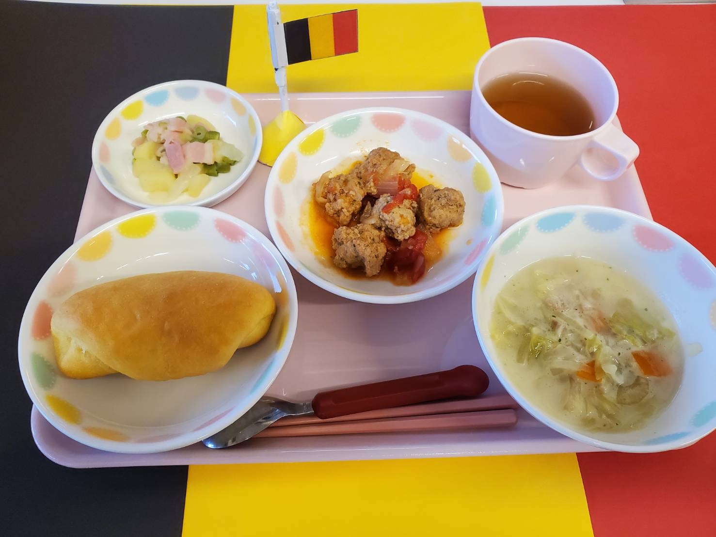 そら(4歳児)・くじら組(5歳児)さんは、先生から、ベルギーについて少しだけお話を聞いてから、いただきました。