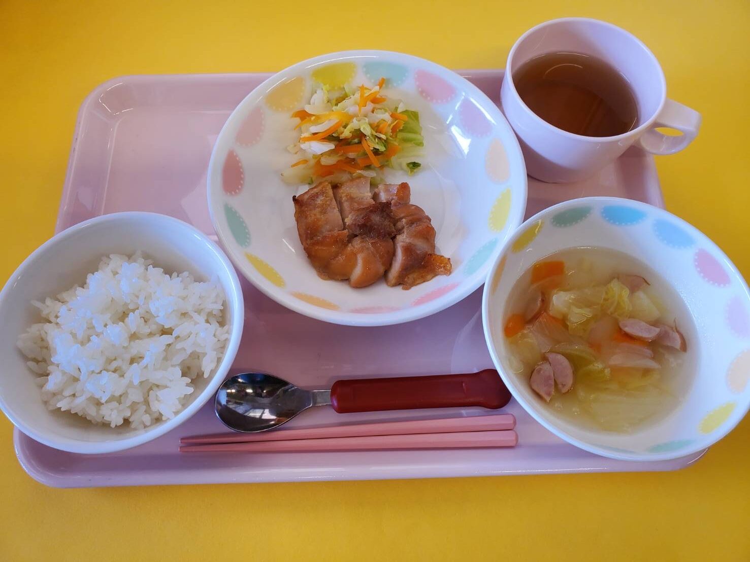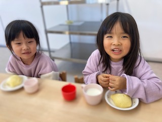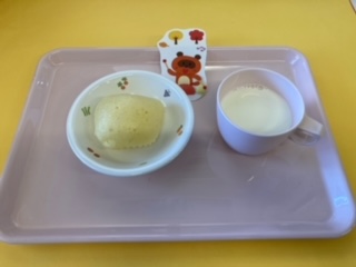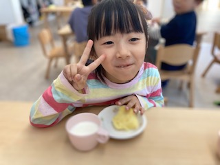 2023.11.21 給食献立 うまかランチ 11月21日(火)献立 ごはん ポトフ風スープ 鶏の照り焼き キャベツの酢の物 牛乳 ヨーグルト蒸しパン ふわふわの蒸しパンがとてもおいしかったようでした。 (そら組(4歳児)) 満足のポーズ! 一覧へ戻る
