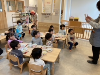 給食の準備を待ちながら、先生の楽しい歌を聴くあめ組さん。もう泣いてませんよ!(^^
