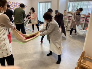 こちらは、だいち組。タオルケットを使ったわらべうた遊びを楽しみました。ゆらゆらしたり、運んでもらったりと笑顔が絶えませんでしたよ。