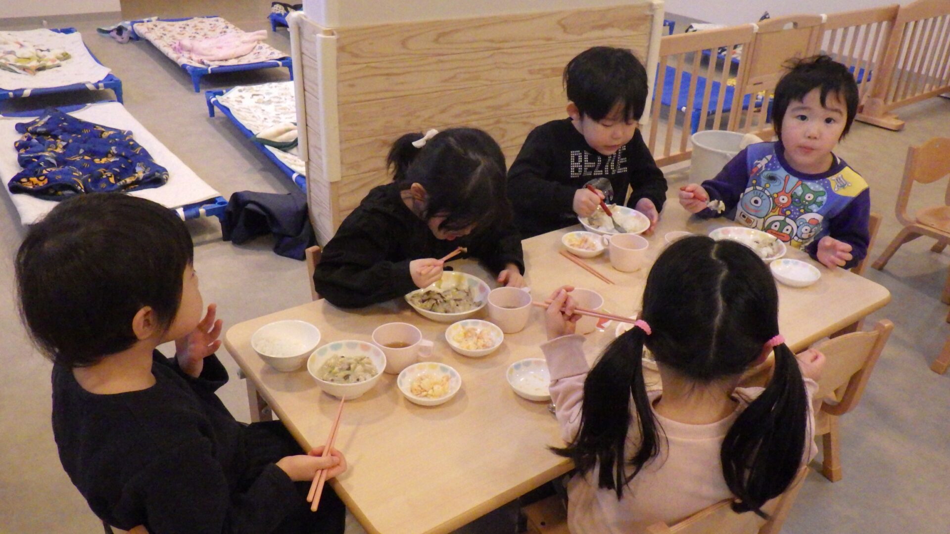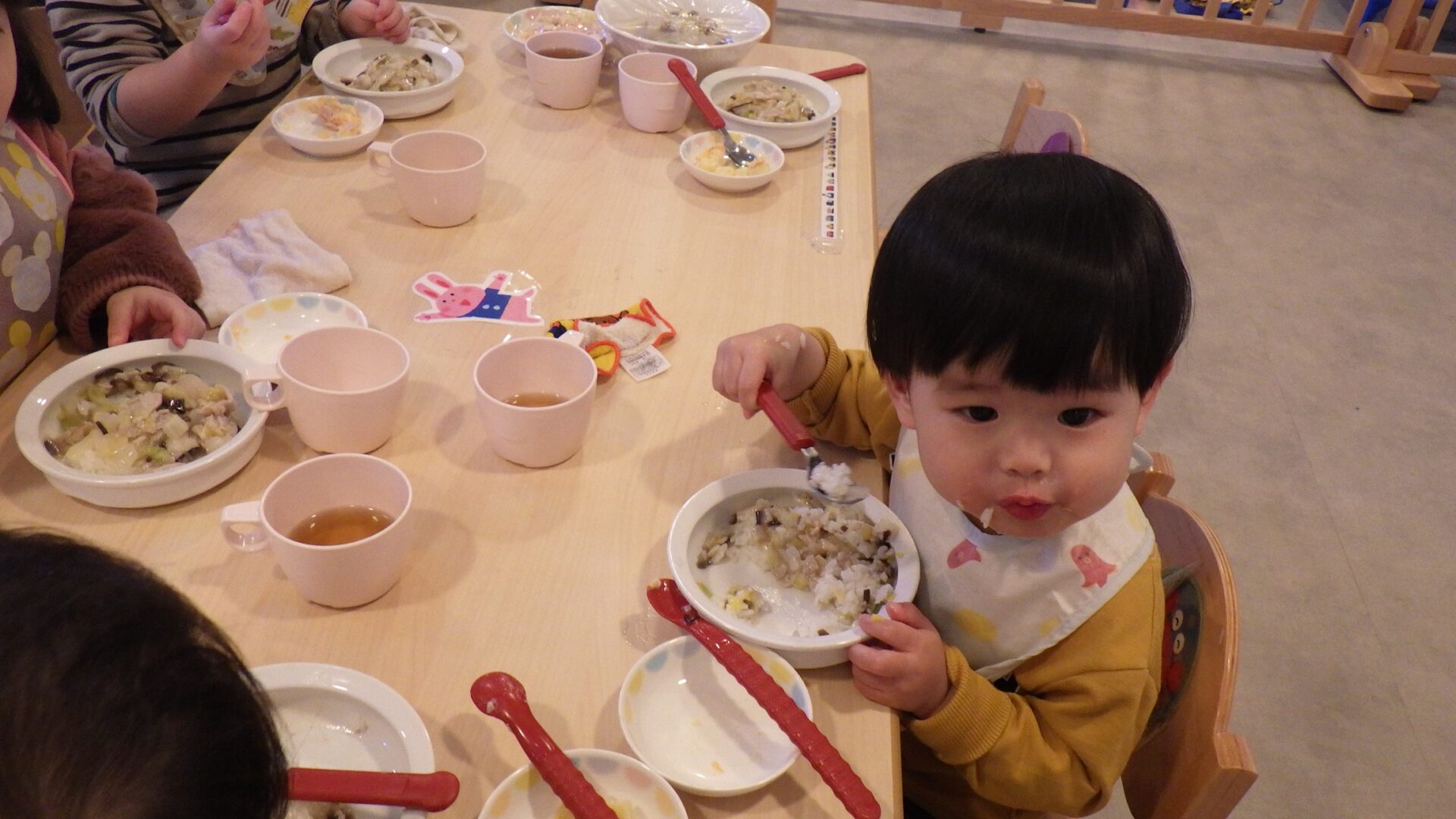 みんなお箸、スプーンを上手に使って食べています。